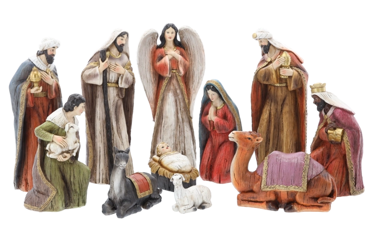 - Jesusbarnet, Maria, Josef, De tre vise mænd, engel, hyrde, får, æsel, kamel