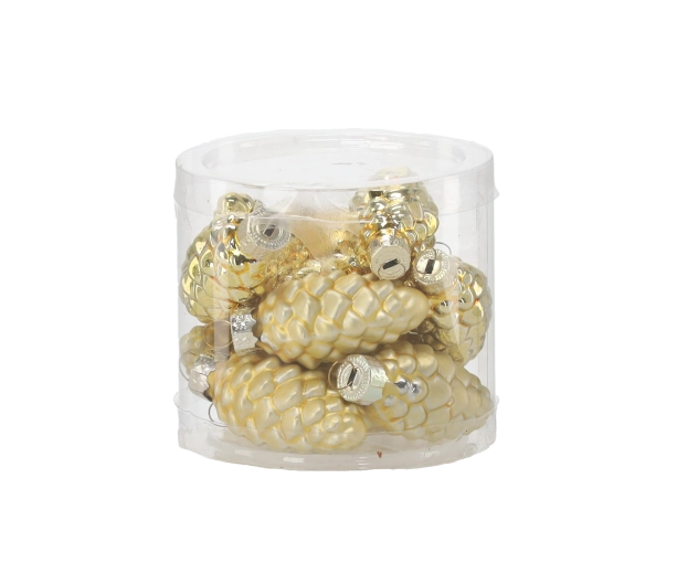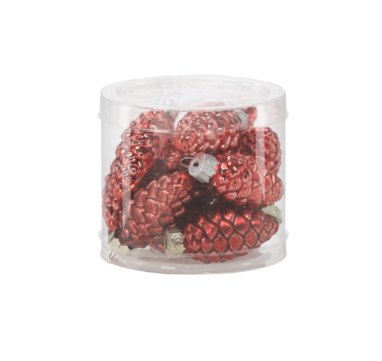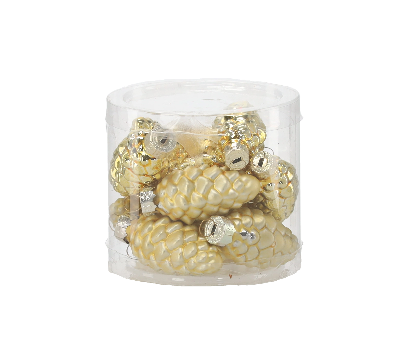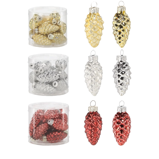 Skab en magisk, festlig stemning derhjemme med et sæt på 12 glaskugler formet som kogler. Hver kogle måler ca. 2,7 × 5,9 cm og er omhyggeligt udformet for et autentisk, naturligt udtryk. Kombinationen af blanke og matte overflader i forskellige farver giver træet elegant glans og dybde i lysreflekserne.