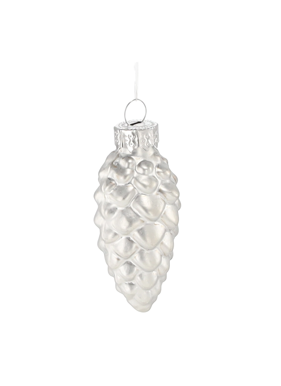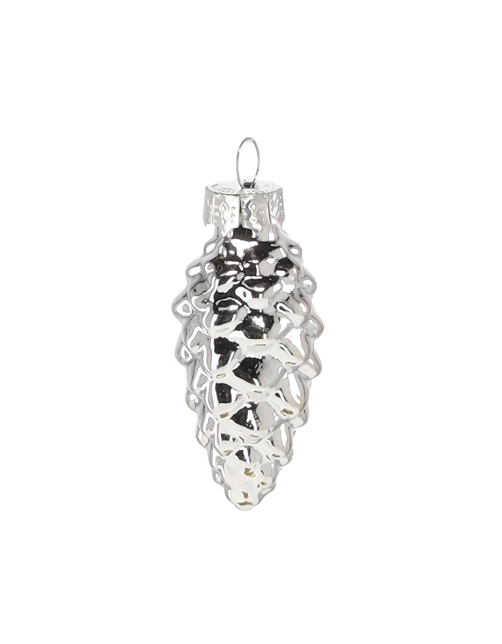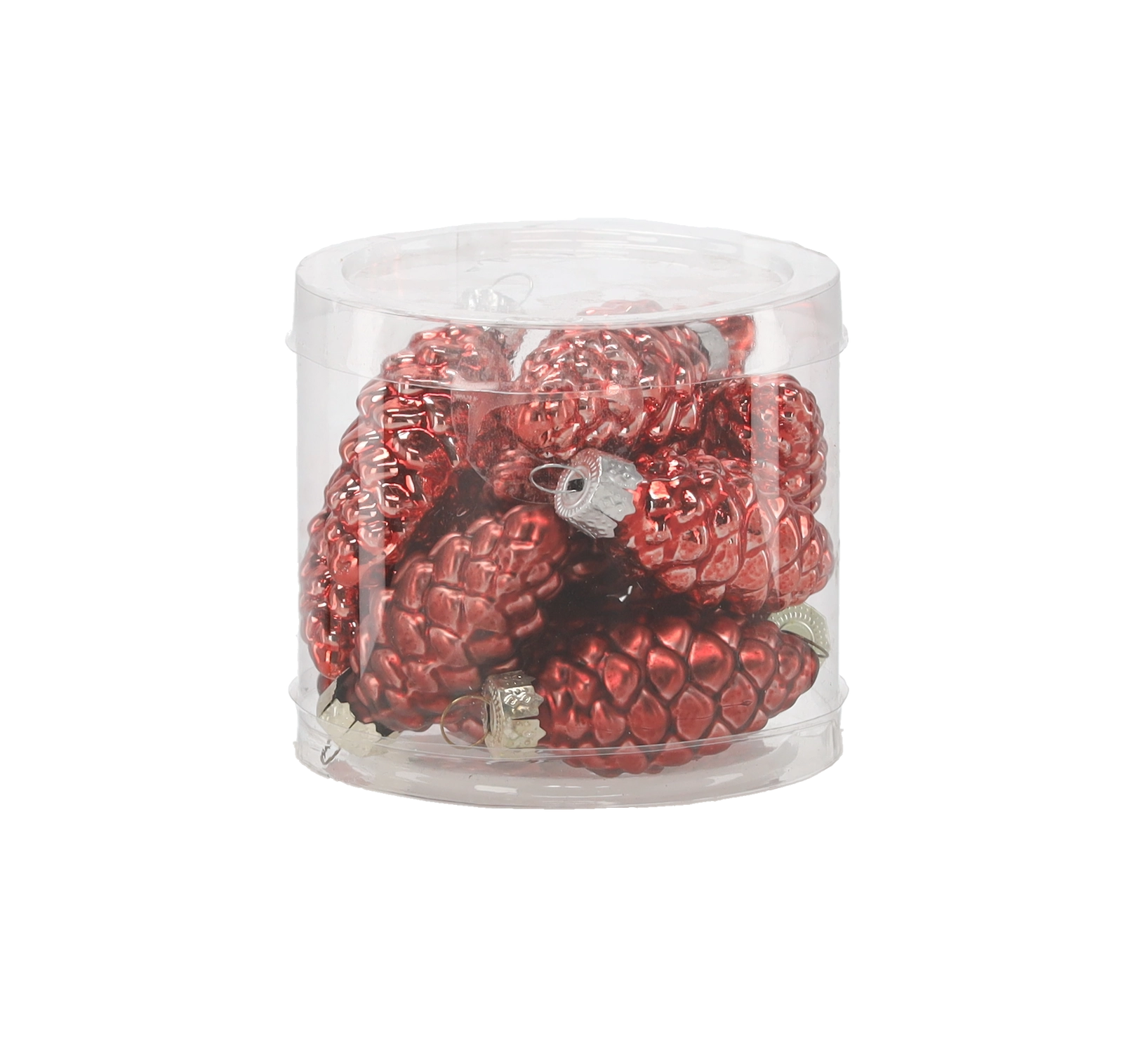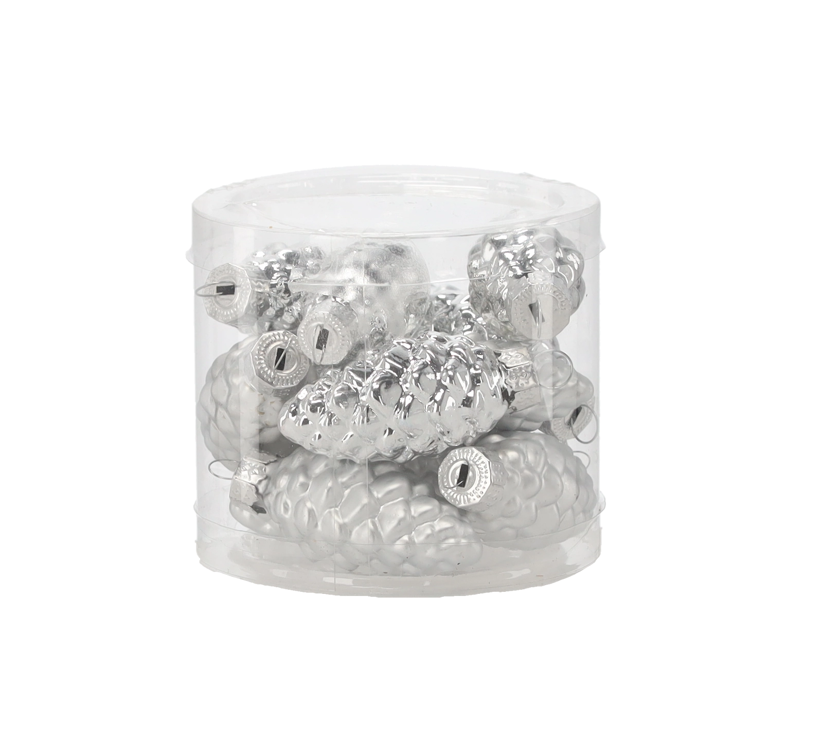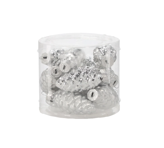 Dette tidløse sæt af glaskogler matcher let både traditionel og moderne julepynt. Den præcise struktur gengiver naturens kogle og tager sig flot ud både i grønt nåleværk og i dekorative arrangementer på kranse og guirlander.