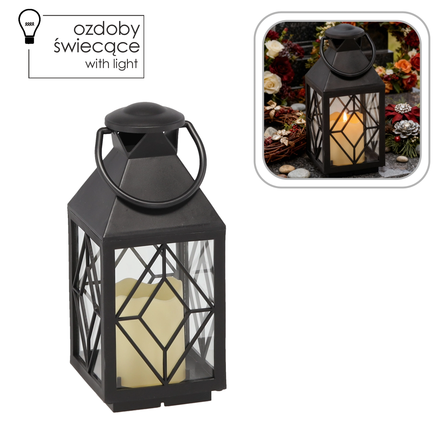 Takket være det praktiske håndtag kan den nemt bæres eller hænges op. Målene 11 × 11 × 26,5 cm gør den til en alsidig dekoration til bord, kommode og altan. Strømforsyningen sker via almindeligt tilgængelige AAA-batterier, så der er hverken brug for kabel eller stikkontakt.