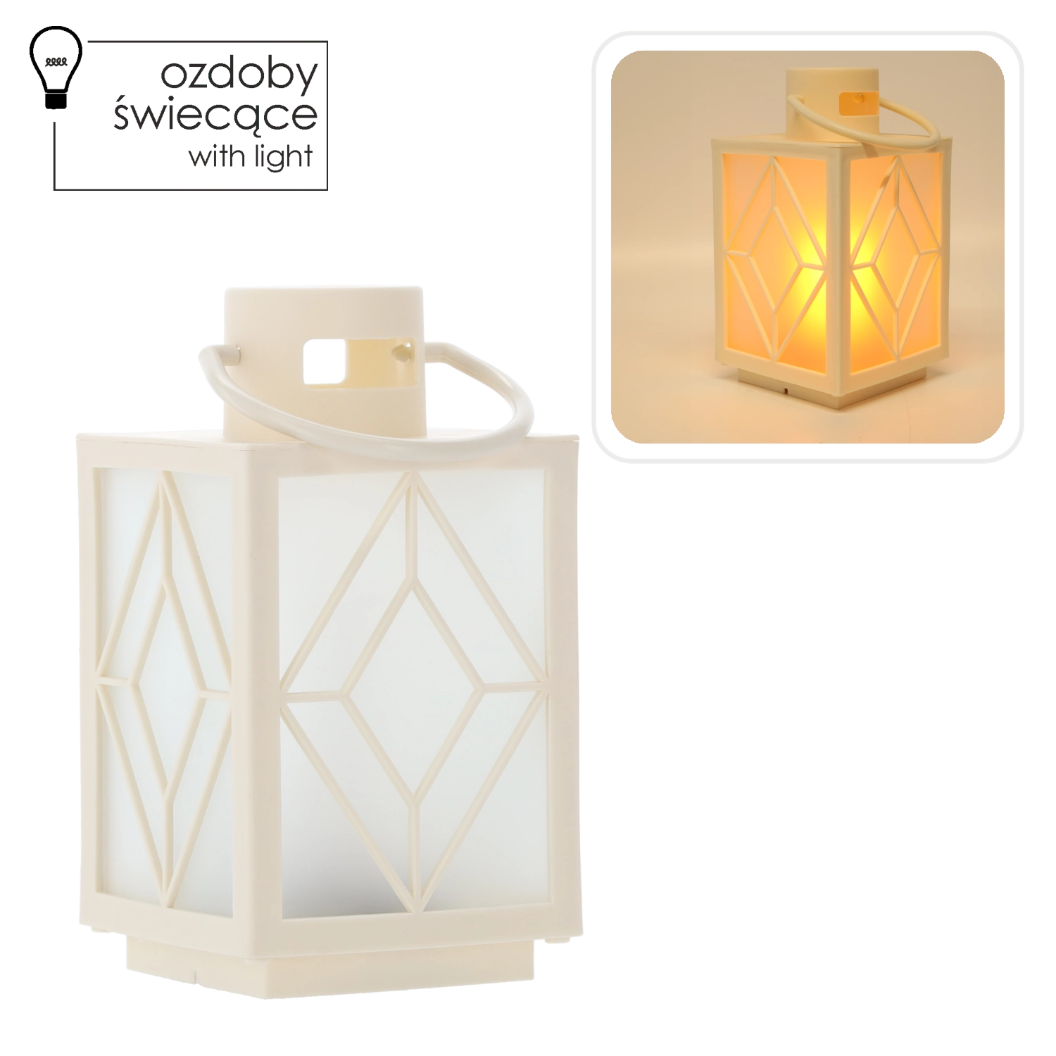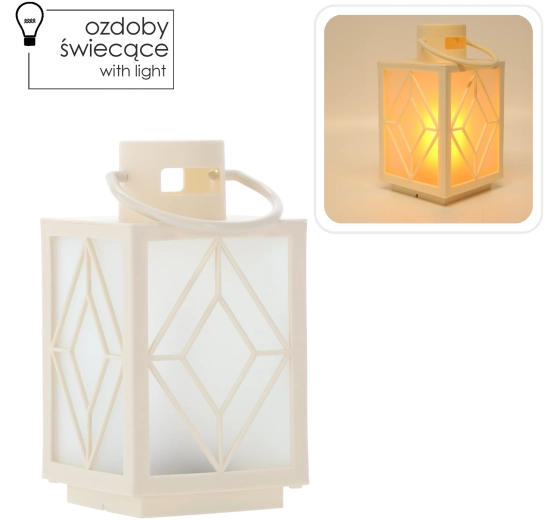 Elegant julelanterne i hvid med integreret LED-lys, som skaber en hyggelig atmosfære både inde og ude. De kompakte mål 11 × 11 × 20,5 cm og det praktiske håndtag til ophæng gør den nem at placere på bordet, vindueskarmen eller hænge på en krog. Drives af 3× AAA-batterier (medfølger ikke) for sikker drift uden kabler og åben flamme.
