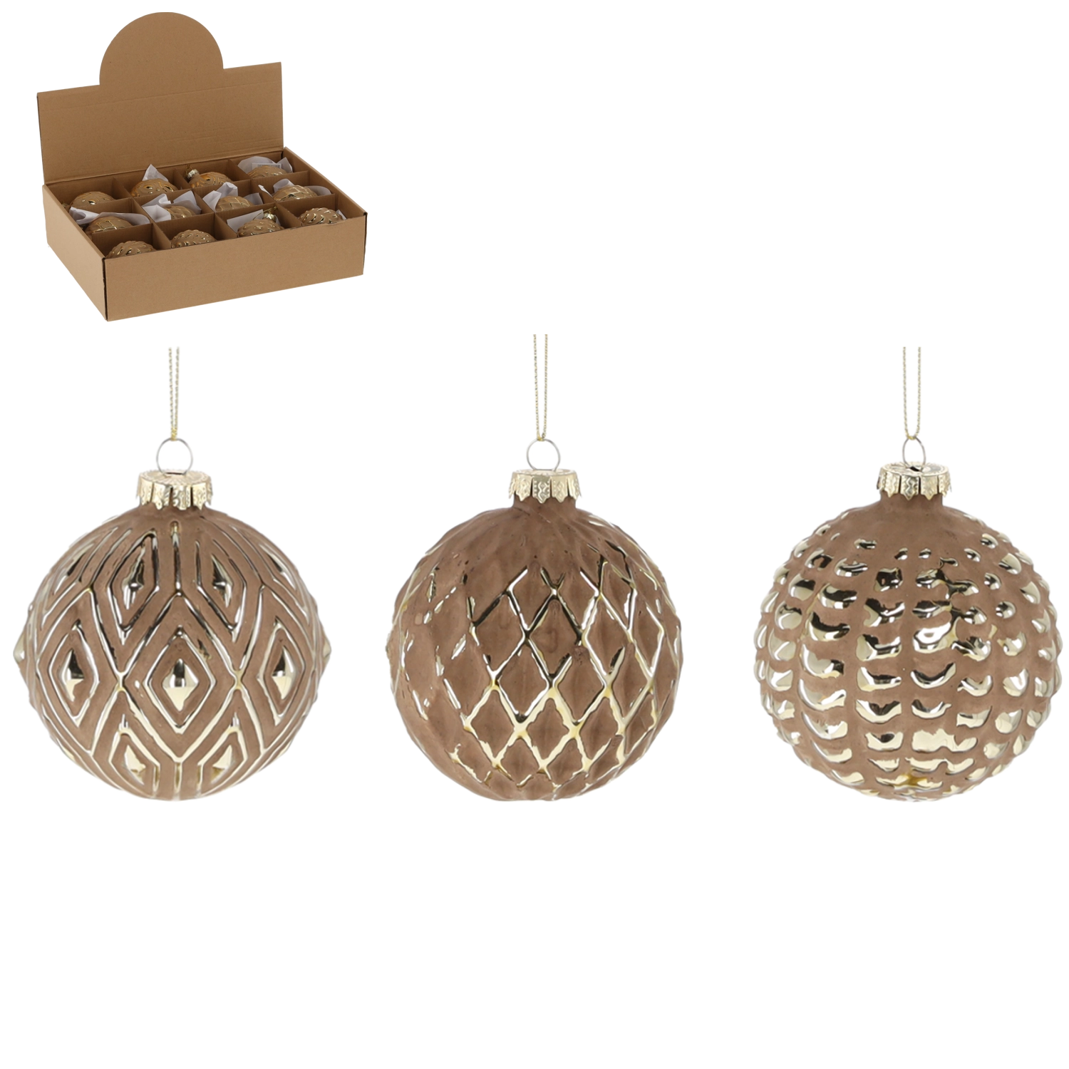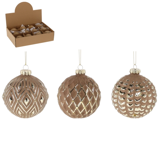 Elegante glasjulekugler med en diameter på 8 cm i brun farve med gyldne ornamenter giver din pynt et eksklusivt og sofistikeret look. Kombinationen af mat overflade og blanke detaljer skaber en iøjnefaldende kontrast, der tager sig smukt ud på træet. Sættet indeholder 12 stk. med forskellige mønstre, som nemt kan matches med anden dekoration og skabe en harmonisk og hyggelig atmosfære i juletiden.