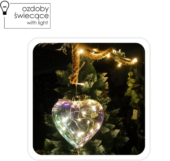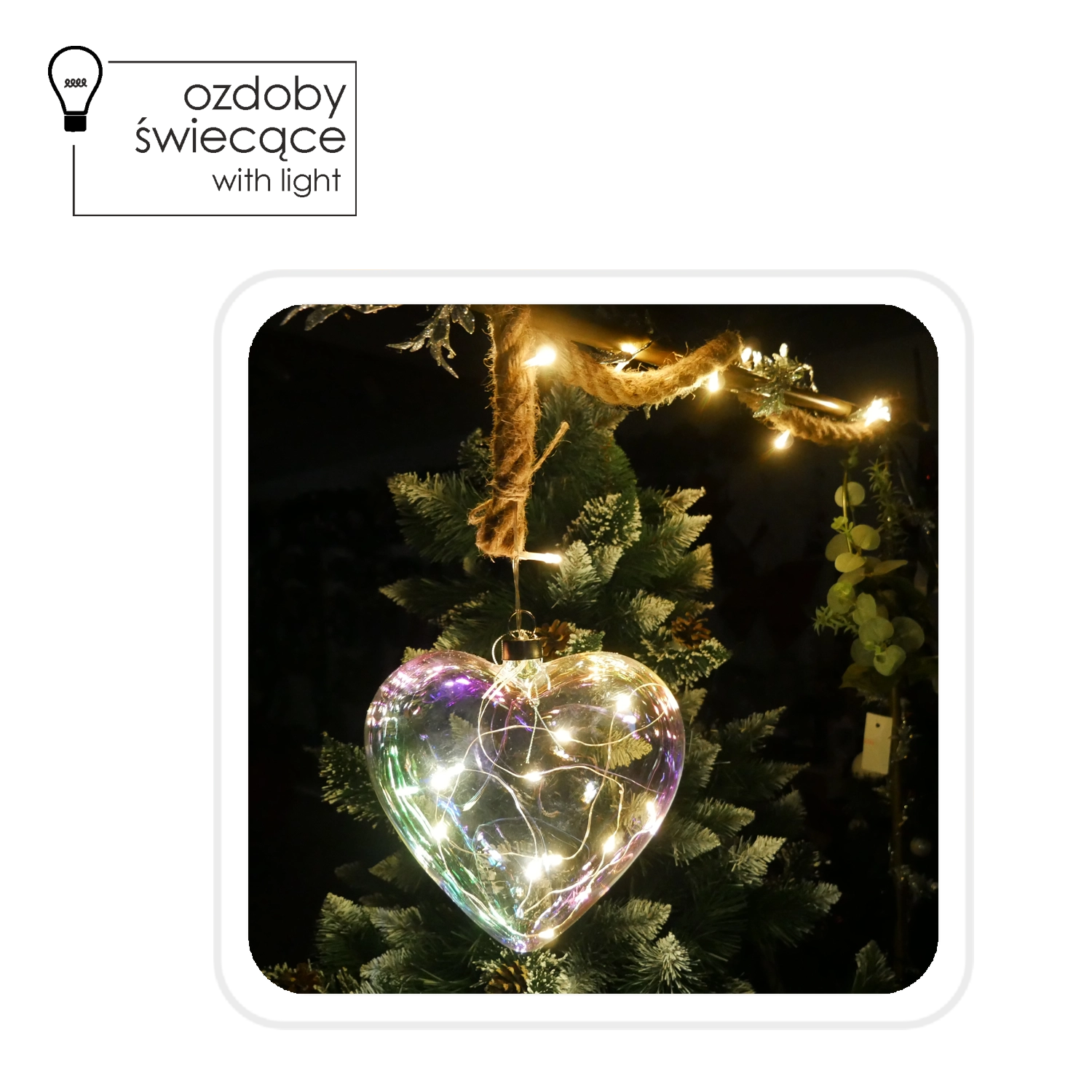 Denne elegante glashjerte-dekoration skaber straks en hyggelig atmosfære i ethvert interiør. Det transparente glas med holografisk effekt reflekterer lyset smukt, og i kombination med 10 LED-dioder i varm hvid farve oplyser den rummet med et blødt, behageligt skær.