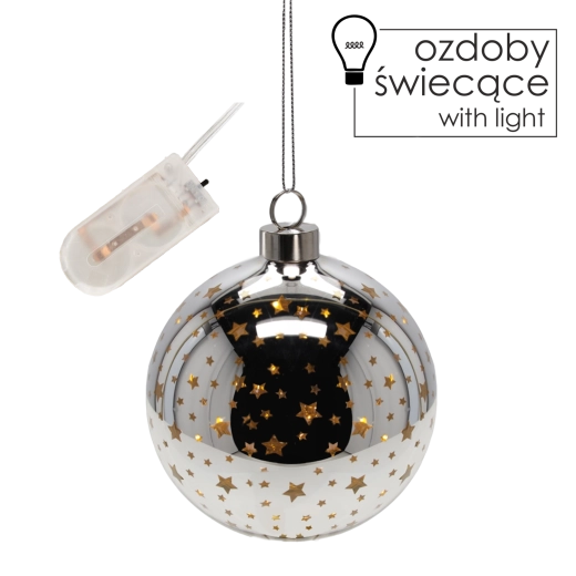 Glaskugle til jul med LED, sølv med stjerner, 10 cm