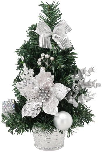 Træet er forpyntet med sølvkugler, sløjfer og tilbehør, så du skal blot placere det. Den stabile potteskjuler er en del af pakken, hvilket sikrer, at dekorationen står sikkert på forskellige overflader. Kvalitetsmaterialer – plast, tråd og tekstil – garanterer lang holdbarhed og modstandsdygtighed, så træet kan glæde dig i mange sæsoner.