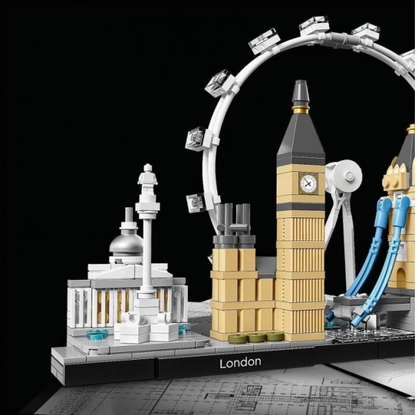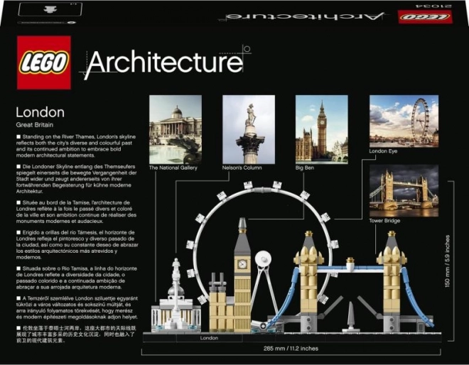 Byggesættet fra LEGO Architecture Skyline-kollektionen gengiver Londons mest kendte seværdigheder i realistiske proportioner og farver. På den elegante base med den dekorative flise “London” finder du National Gallery, Nelson’s Column, London Eye, Big Ben (Elizabeth Tower) og Tower Bridge. Gennemsigtige elementer i basen illustrerer floden Themsen, så modellen ser flot ud fra alle vinkler.