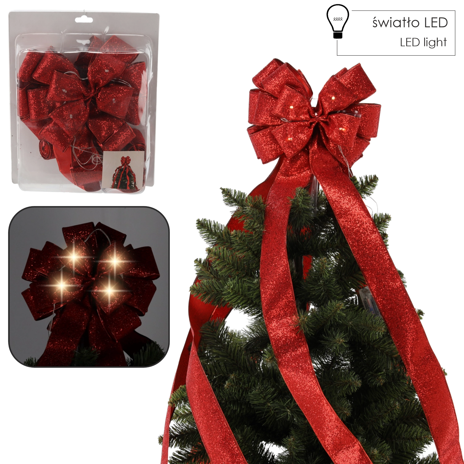 Denne stilfulde røde kokarde er designet til toppen af juletræet, hvor den straks tiltrækker opmærksomhed og fremhæver træets form. De lange bånd på 2,1 m falder elegant ned langs grenene og skaber et harmonisk, repræsentativt udtryk. Integrerede LED-dioder udsender et blødt lys, der understreger den festlige stemning i dit hjem.