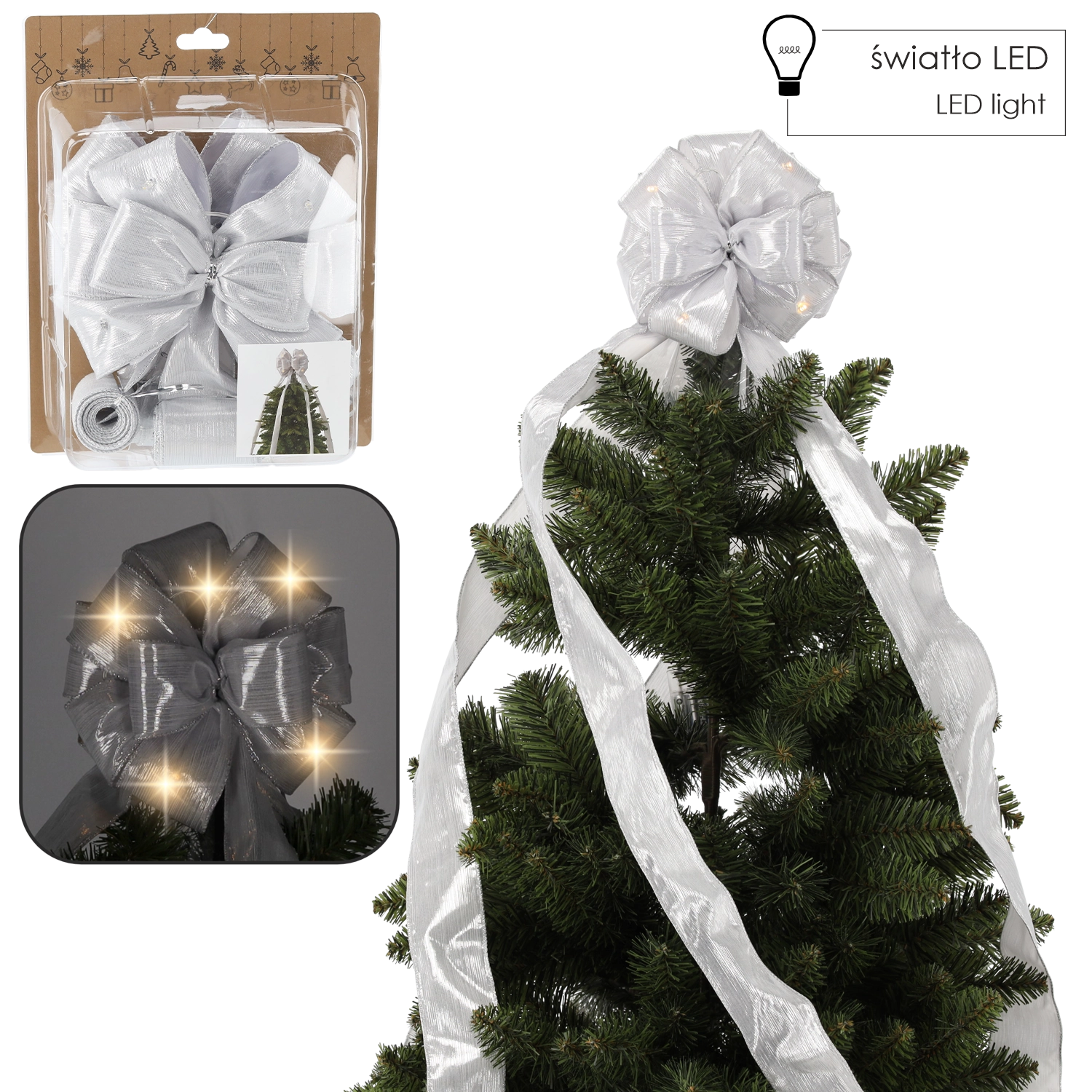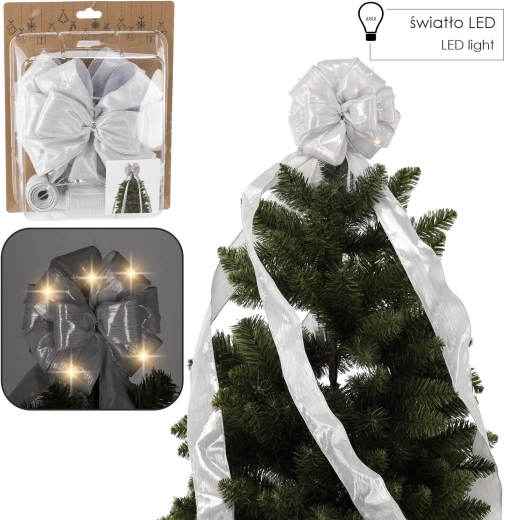 Elegant sølvfarvet sløjfe med lysende LED-dioder og lange 1,8 m bånd fuldender smukt toppen af juletræet. Let konstruktion for nem montering, sikker drift med lav spænding og en tilstrækkelig lang strømkabel på 1,8 m skaber en bekvem og effektiv løsning til moderne juleudsmykning.