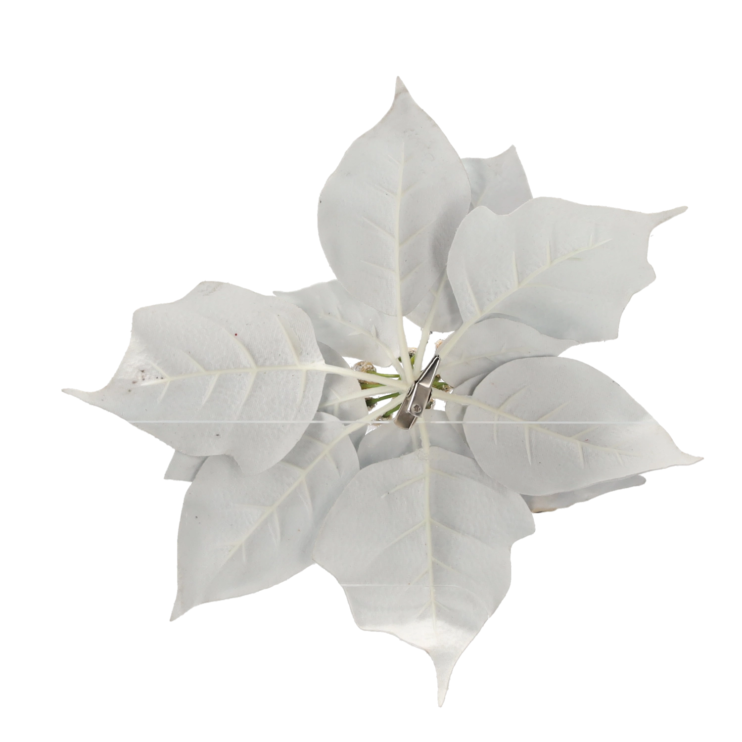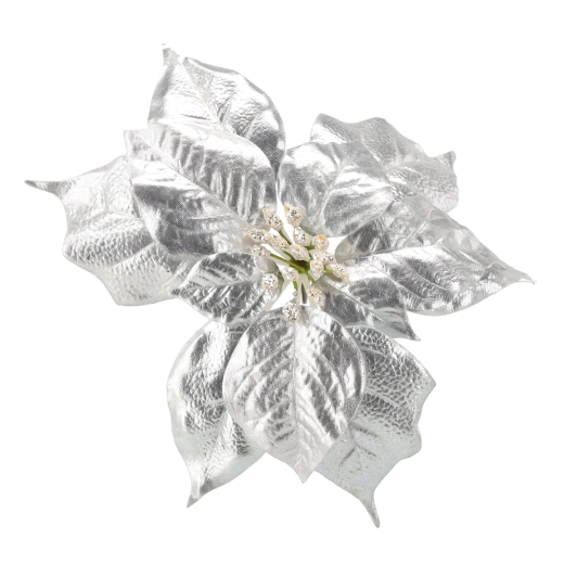 Elegant kunstig julestjerne (poinsettia) i højden 25 cm i sølvfarvet udførelse, der giver dit hjem en festlig glans. Kvalitetsmateriale efterligner troværdigt udseendet af en levende blomst, og den praktiske clip gør det nemt at fastgøre den på juletræ, kranse, guirlander eller andre dekorationer.