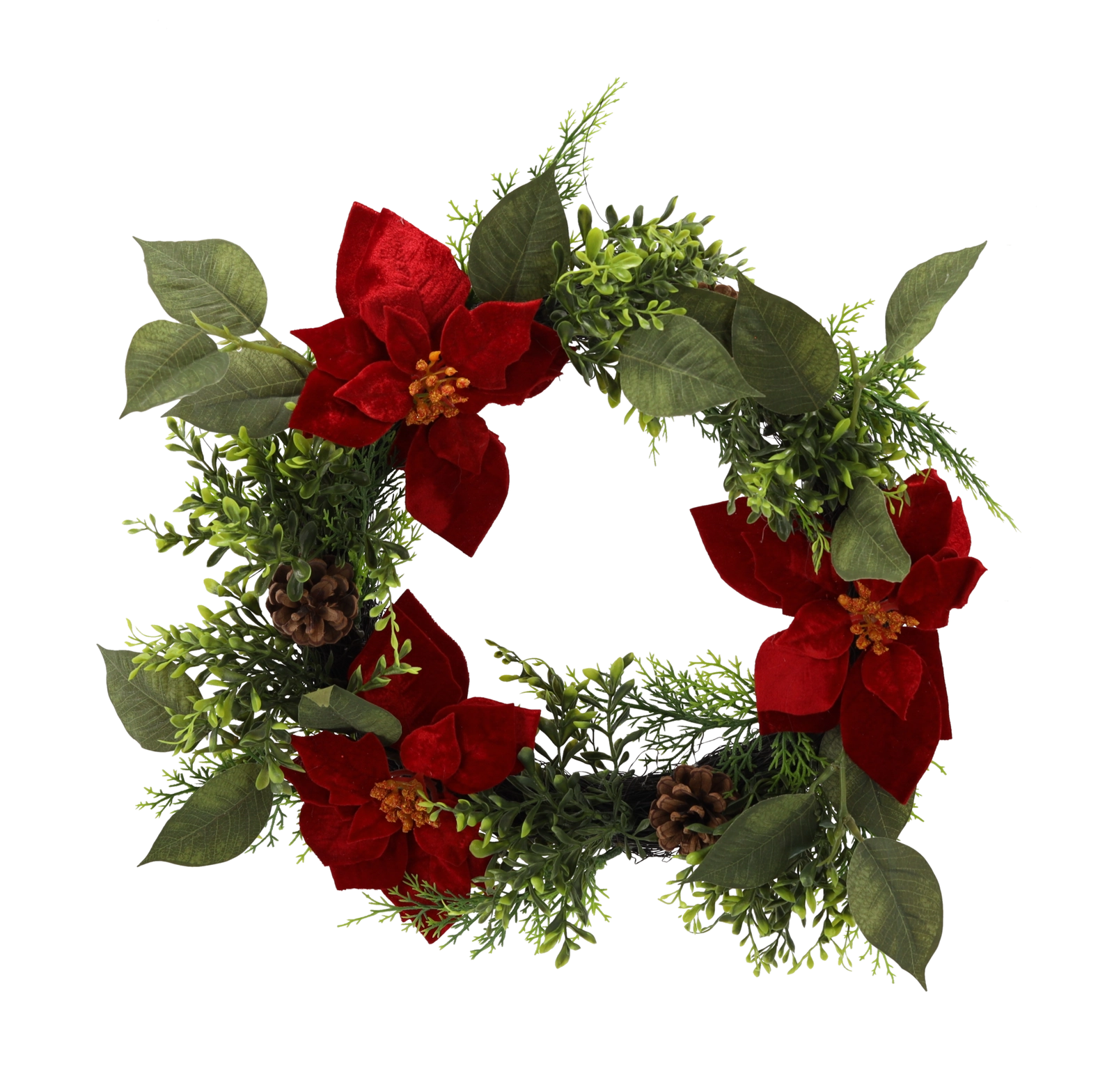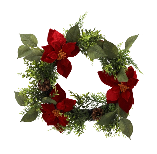 Skab en fortryllende juleudsmykning derhjemme med en krans, der udmærker sig ved realistisk udformning af poinsettia-blade og -blomster. Takket være de præcise detaljer virker den naturlig, samtidig med at den bevarer sit perfekte udseende i mange sæsoner. Det alsidige design passer nemt til både klassisk og moderne interiør.