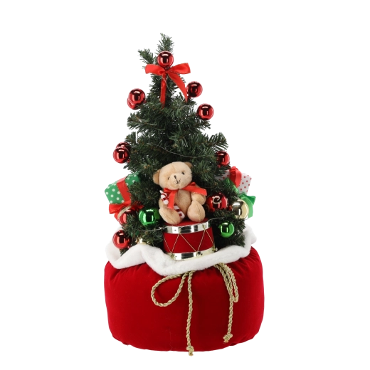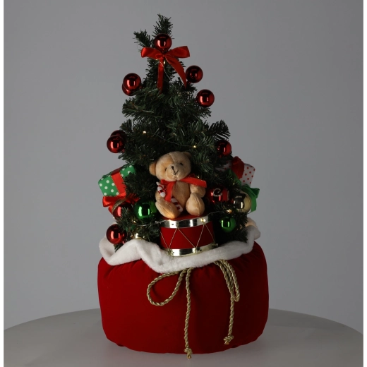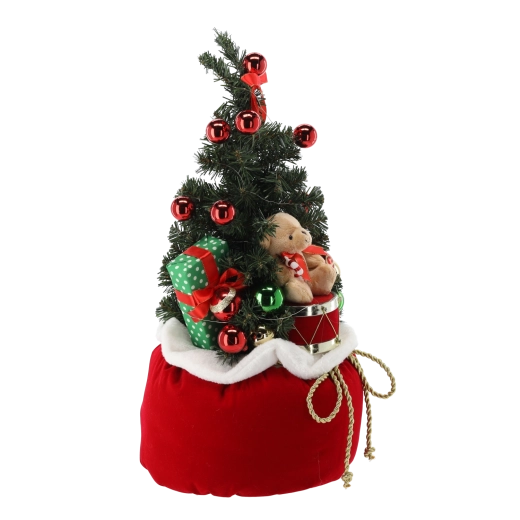 Den bløde røde pose med hvid kant og guldsnøre giver dekorationen et smart udtryk og holder træet sikkert på plads.