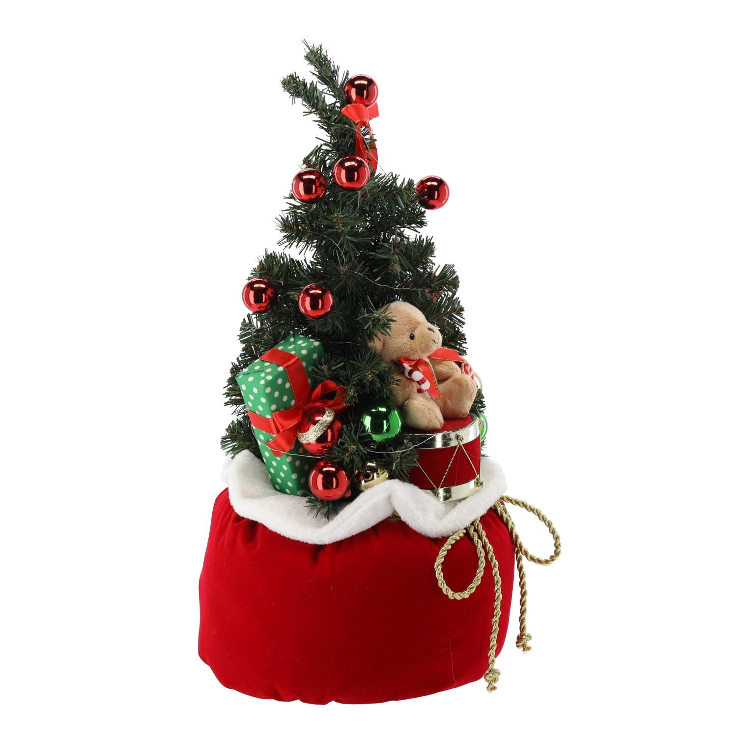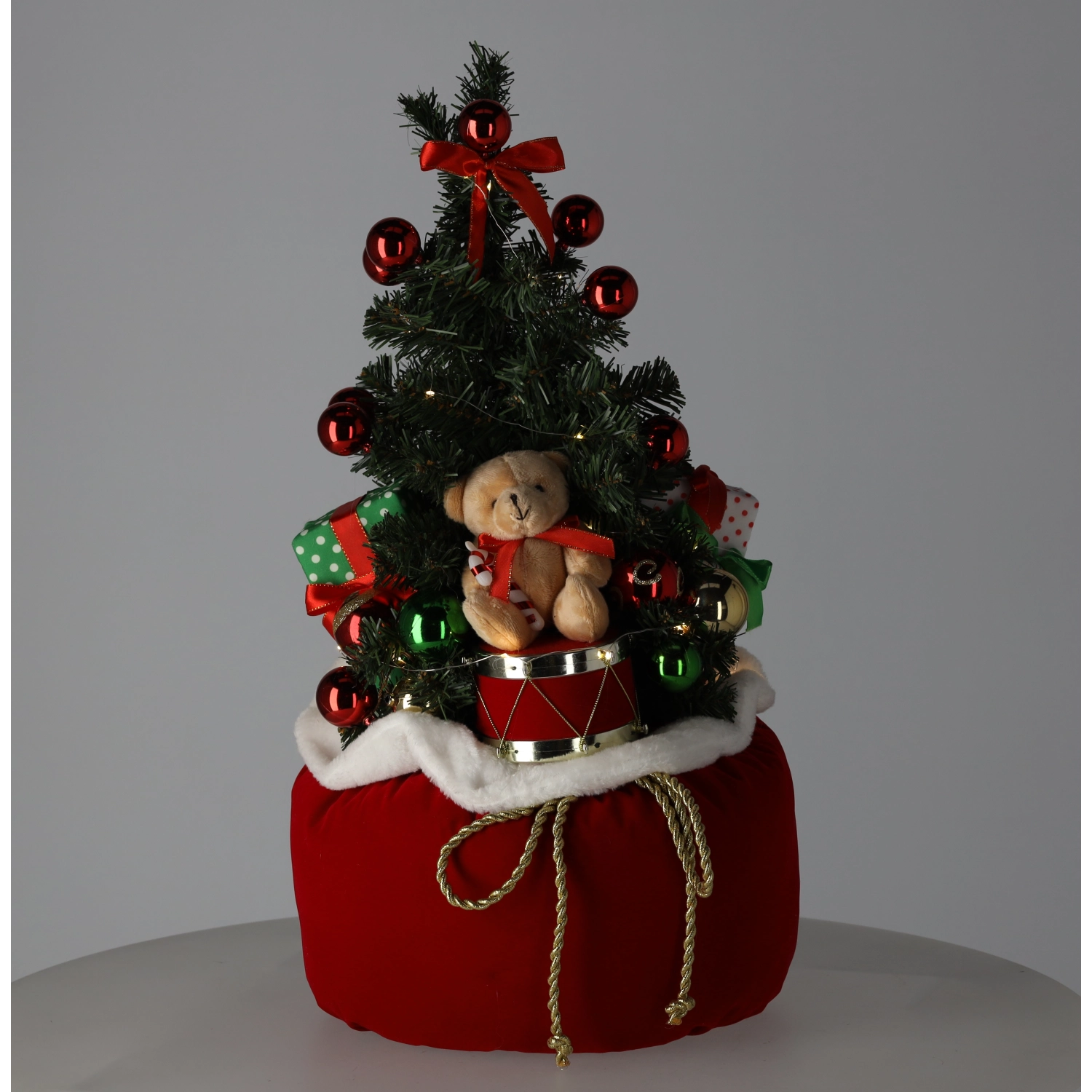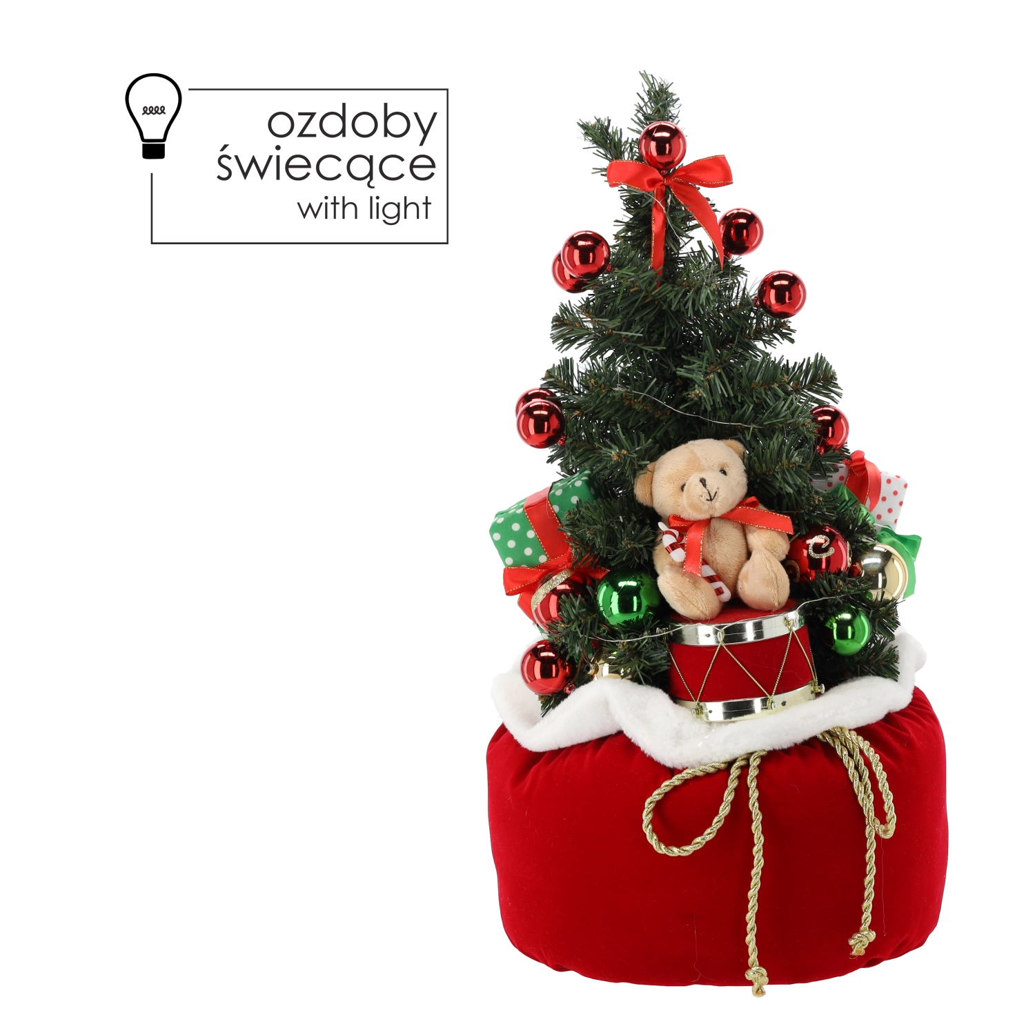 Træet er udsmykket med røde og grønne ornamenter, sløjfer og søde dekorationer, så det skal blot pakkes ud og stilles frem.