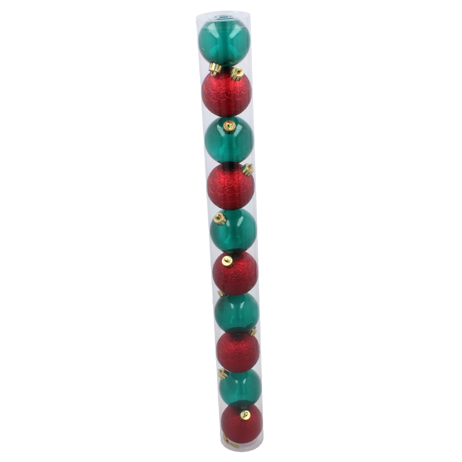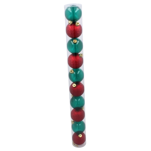 Elegant sæt med ti juleornamenter med en diameter på 6 cm i en kombination af rød og flaskegrøn, som giver dit træ et traditionelt præg. Det slidstærke, splintsikre materiale og mixet af blanke og matte overflader reflekterer lyset smukt og sikrer lang holdbarhed. Den praktiske gennemsigtige rør-emballage gør opbevaring og transport nemt.