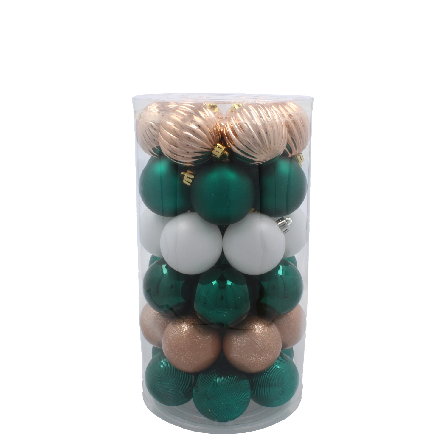 Giv dit hjem et elegant, festligt touch. Dette komplette sæt julekugler i trendy nuancer kombinerer blid champagne, klassisk grøn og ren hvid for et perfekt afbalanceret udtryk. Forskellige overfladebehandlinger – blank, mat, riflet og let glimmer – skaber dybde og reflekser, der understreger julens magi.