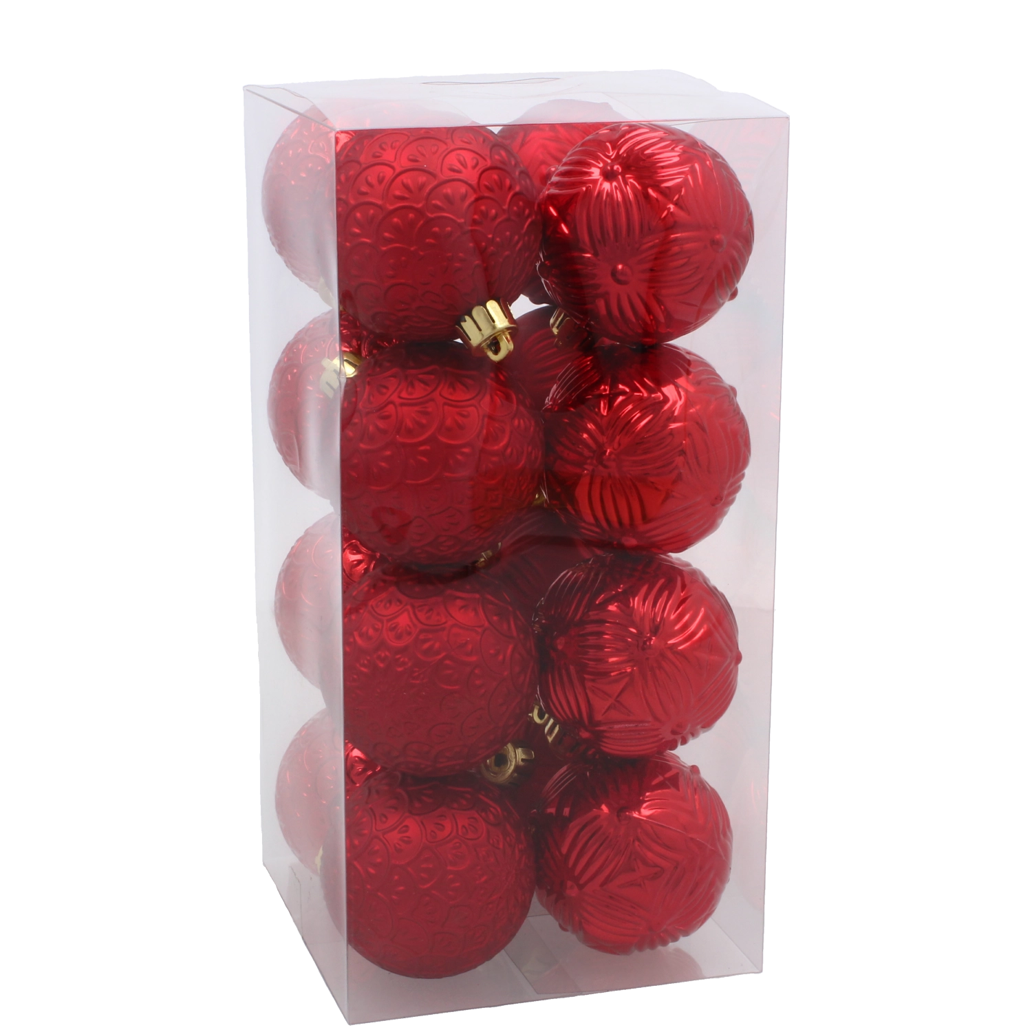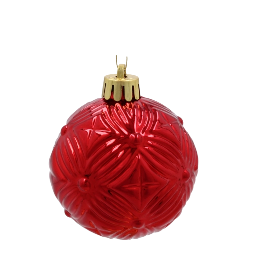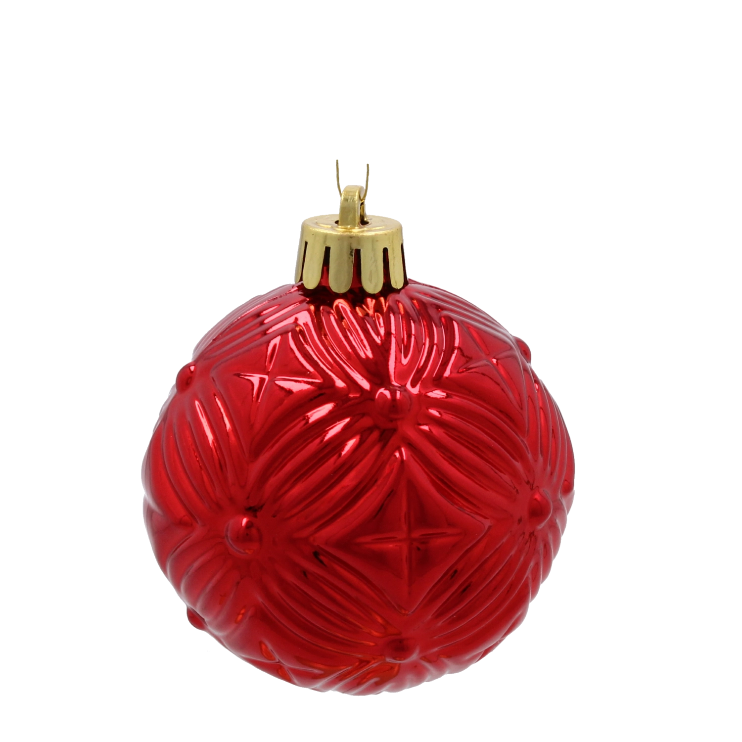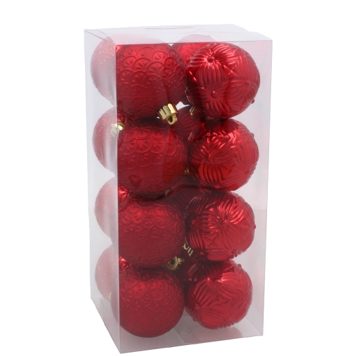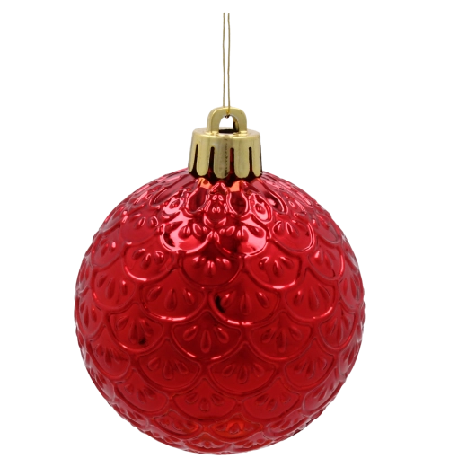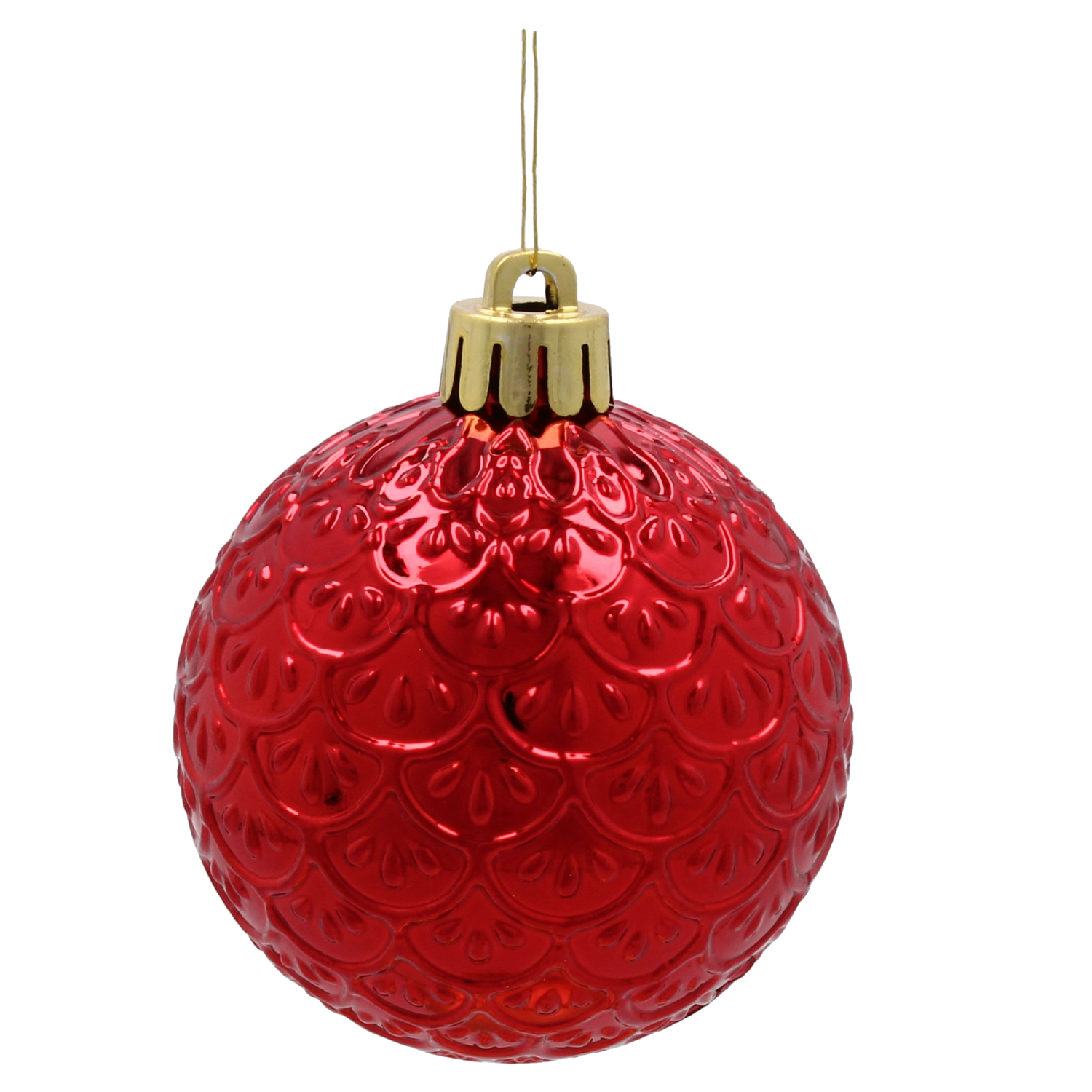 Dette alsidige sæt pynt i harmoniske nuancer af rød, guld og sølv skaber straks en festlig stemning. Hver kugle er let, har præget dekoration og er udstyret med metalhætte og snor for nem ophængning på grene, kranse eller guirlander. Det robuste plast sikrer lang levetid selv ved hyppig håndtering.