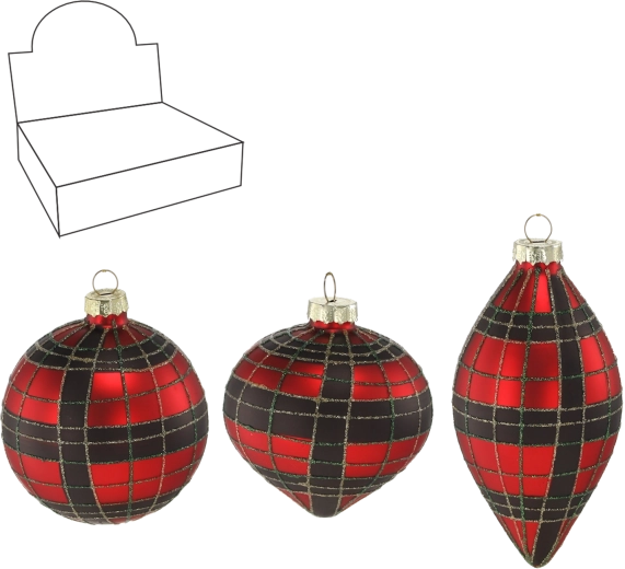 Forfin din juleudsmykning ned til mindste detalje. Disse glasornamenter i rød og sort med ternet motiv giver træet et markant, men stilfuldt udtryk. Den glansfulde overflade og den omhyggelige farveudførelse sikrer, at pynten bliver en iøjnefaldende del af den festlige stemning.