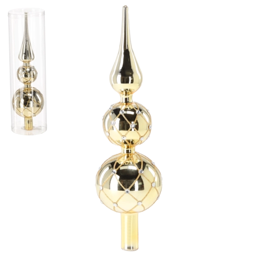 Denne gyldne glastop er et iøjnefaldende sidste touch til enhver juleudsmykning. Dens elegante slanke form og luksuriøse glans skaber en betagende effekt, der skiller sig ud på både traditionelle og moderne træer. Det præcist udførte glitrende net med dekorative krystaller bryder lyset smukt og giver dekorationen dybde og klarhed.