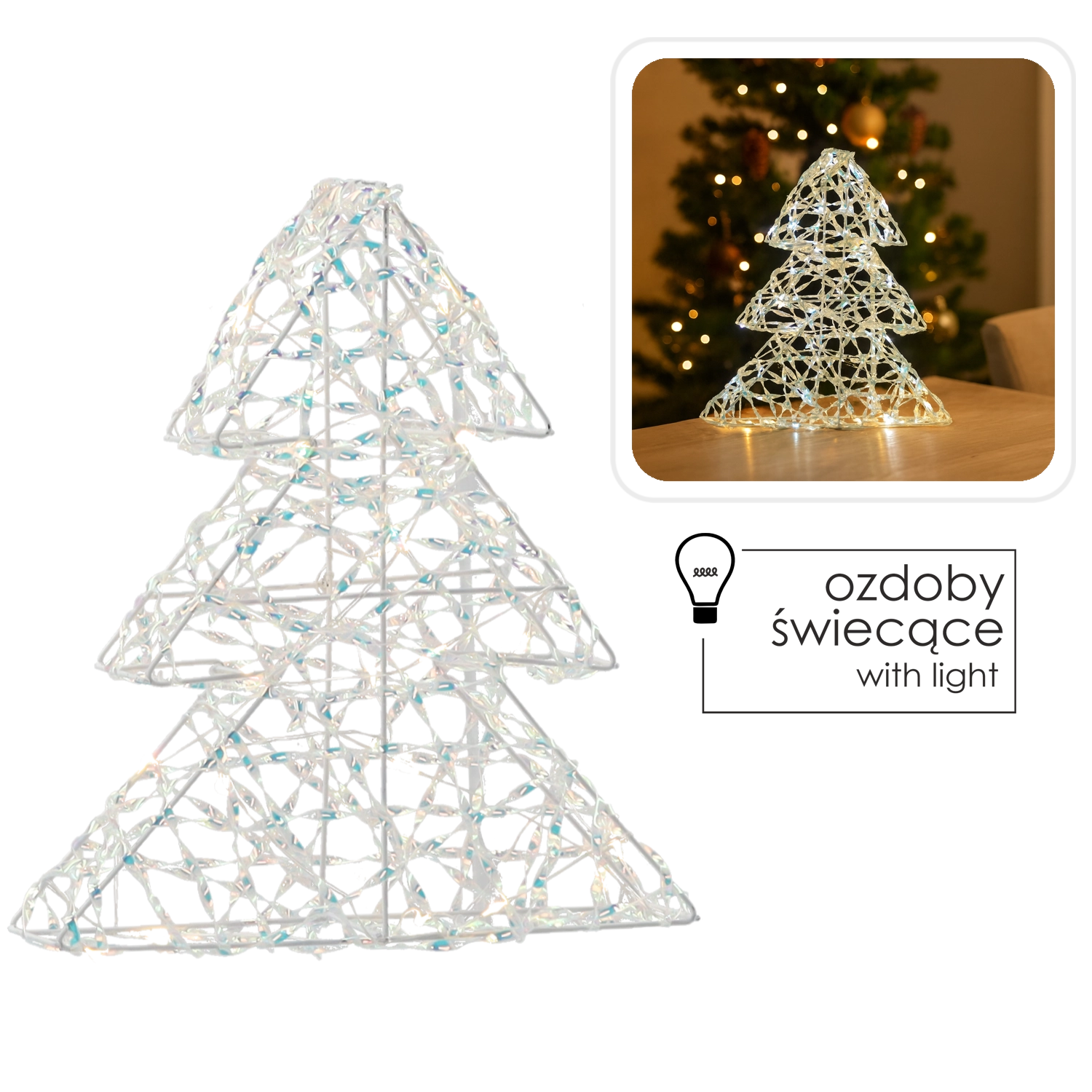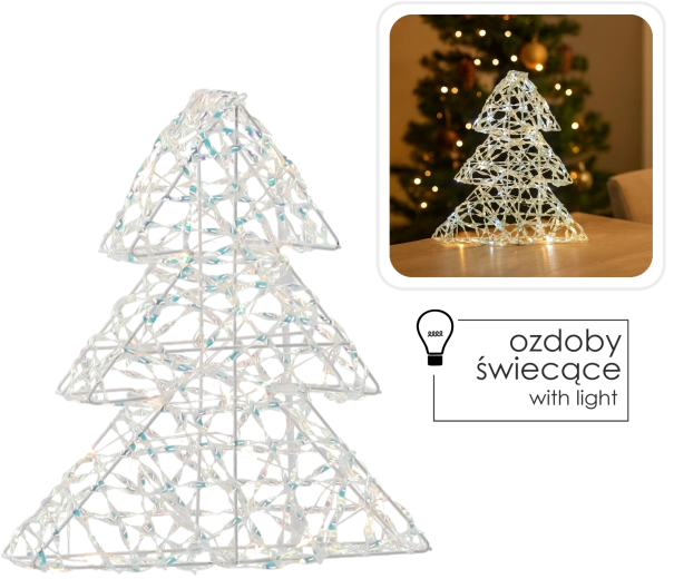 Elegant dekorativt træ på 30 cm med varm LED-belysning og regnbuefarvet (iriserende) effekt, som fylder dit hjem med en hyggelig atmosfære. Takket være batteridrift kan du nemt placere det på bordet, kommoden eller vindueskarmen uden behov for stikkontakt. Energibesparende LED-dioder sikrer lavt forbrug og lang levetid.
