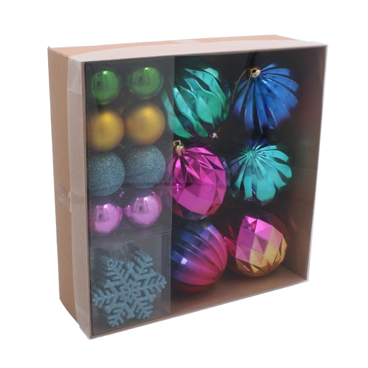 Dette alsidige sæt er ideelt til stilfuld udsmykning af juletræet og sæsonbetonede arrangementer i hjemmet. Du finder både mindre og større kugler samt glitrende snefnug, som tilsammen skaber en harmonisk komposition. Takket være den lette og brudsikre konstruktion er ornamenterne velegnede til hjem med børn eller kæledyr.