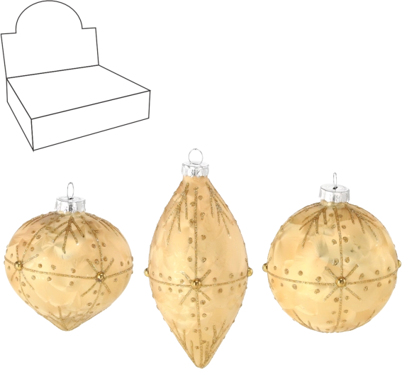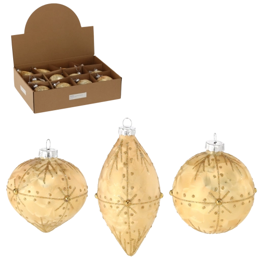 Elegante glasjulepynt i luksuriøs gylden farve giver dit juletræ ægte glans. Sættet kombinerer en mix af former for en imponerende effekt: runde kugler med en diameter på 8 cm og aflange pynt på 6 × 13 cm. Hånddekorerede detaljer og et klassisk gyldent design understreger den festlige stemning og er nemme at matche med anden dekoration.