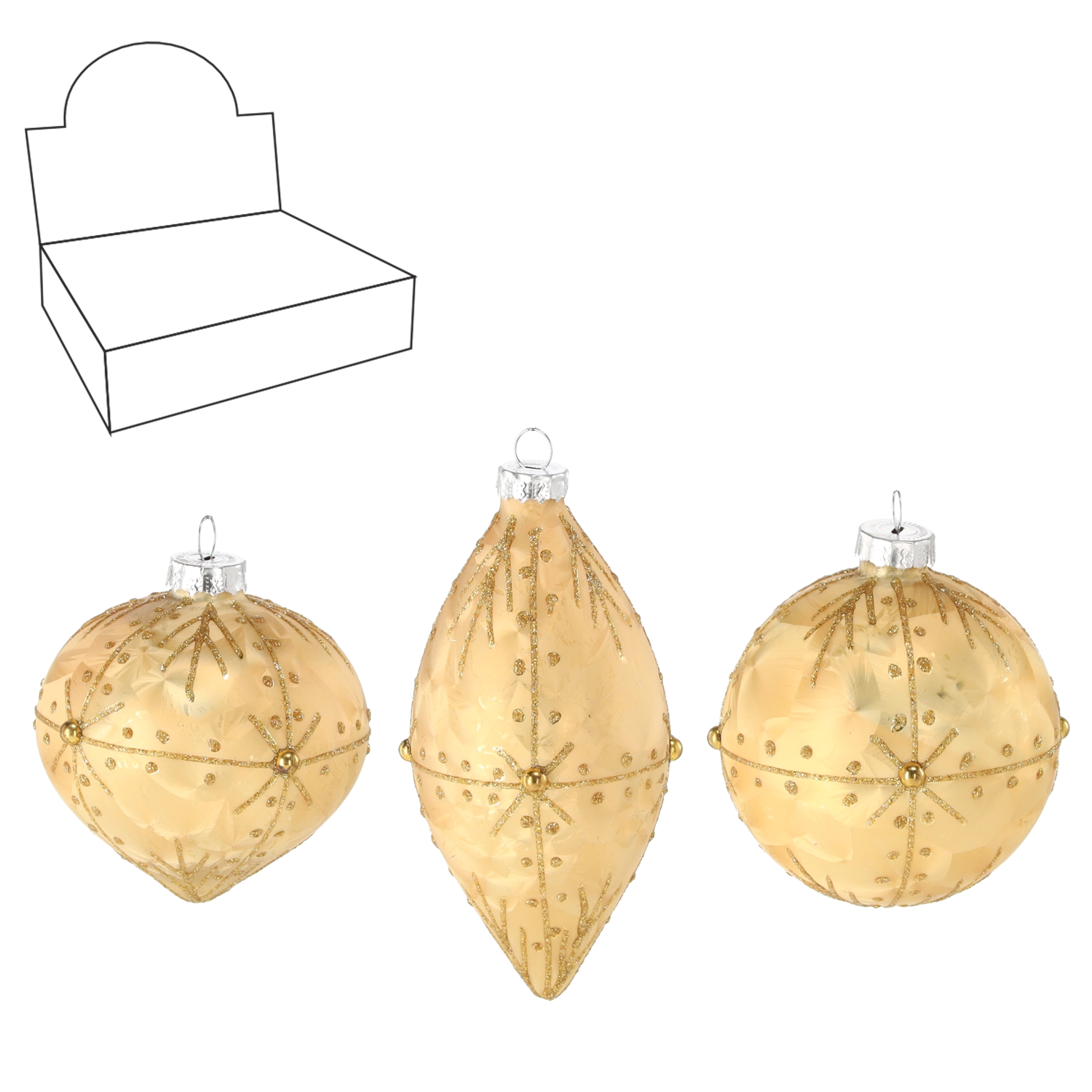 Skab et harmonisk og stilfuldt udtryk på træet med en kombination af runde og aflange glasornamenter i tidløs gylden. Præcis udførelse og dekoration giver smukke lysreflekser, der understøtter den hyggelige julestemning.