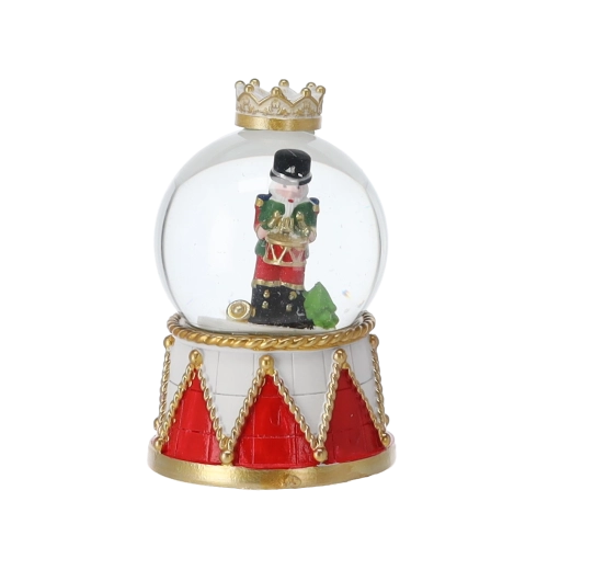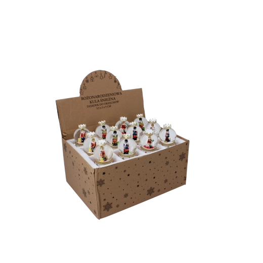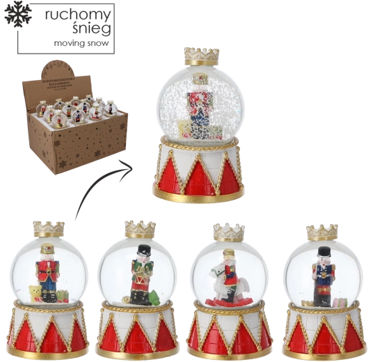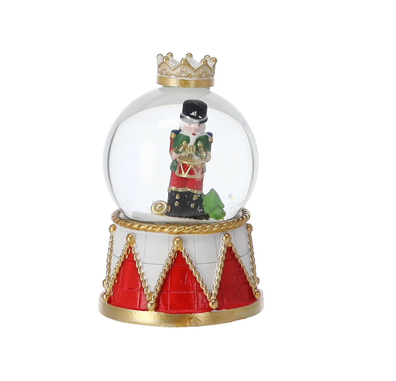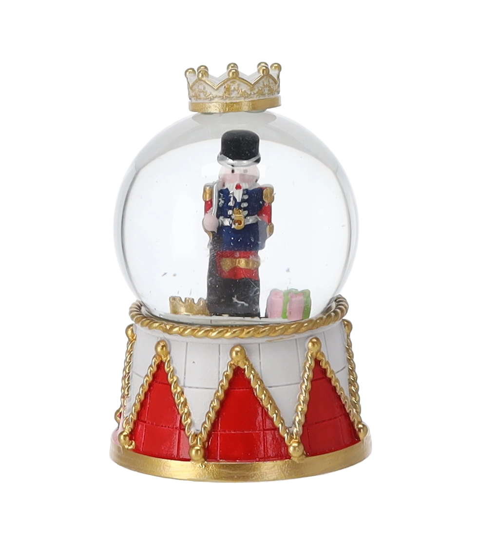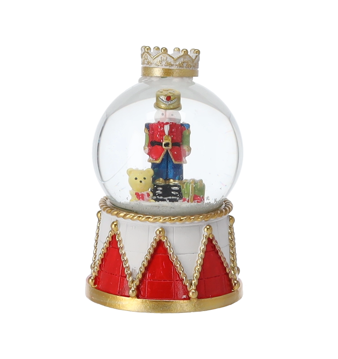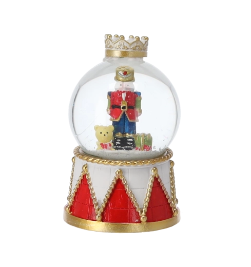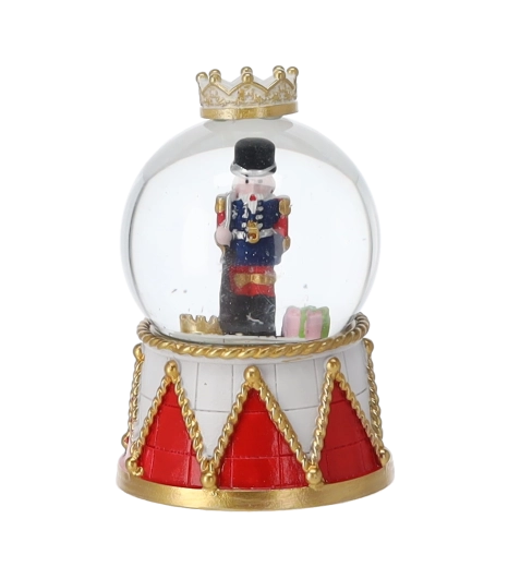Hvert stykke prydes af en klar glaskuppel og en dekorativ sokkel i rød‑gylden trommedesign med krone. De kompakte mål gør den nem at placere på sofabord, hylde eller festbord. Takket være mixet af nøddeknækkermotiver kan du nemt matche kuglen med resten af pynten.