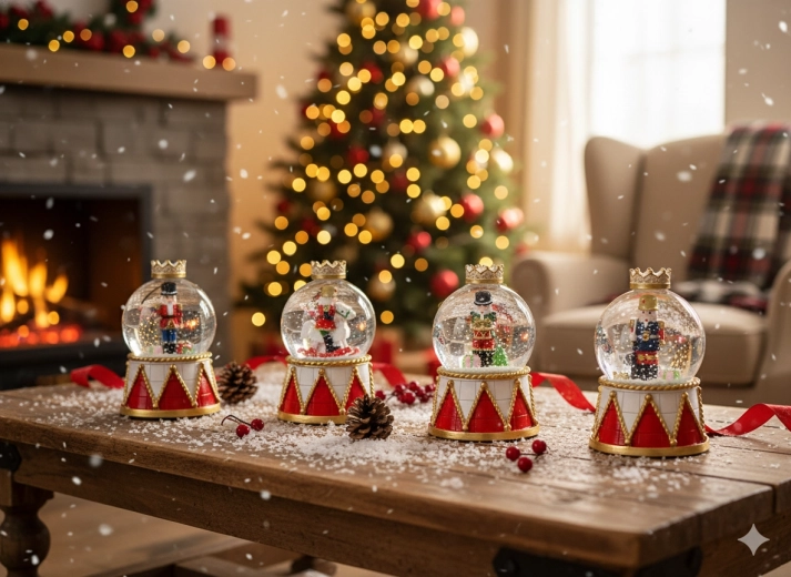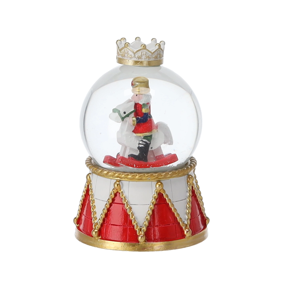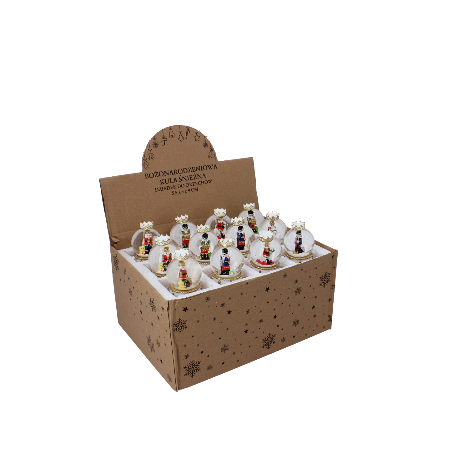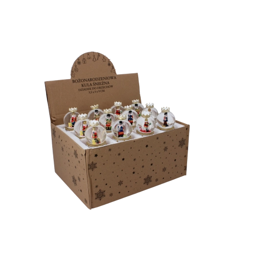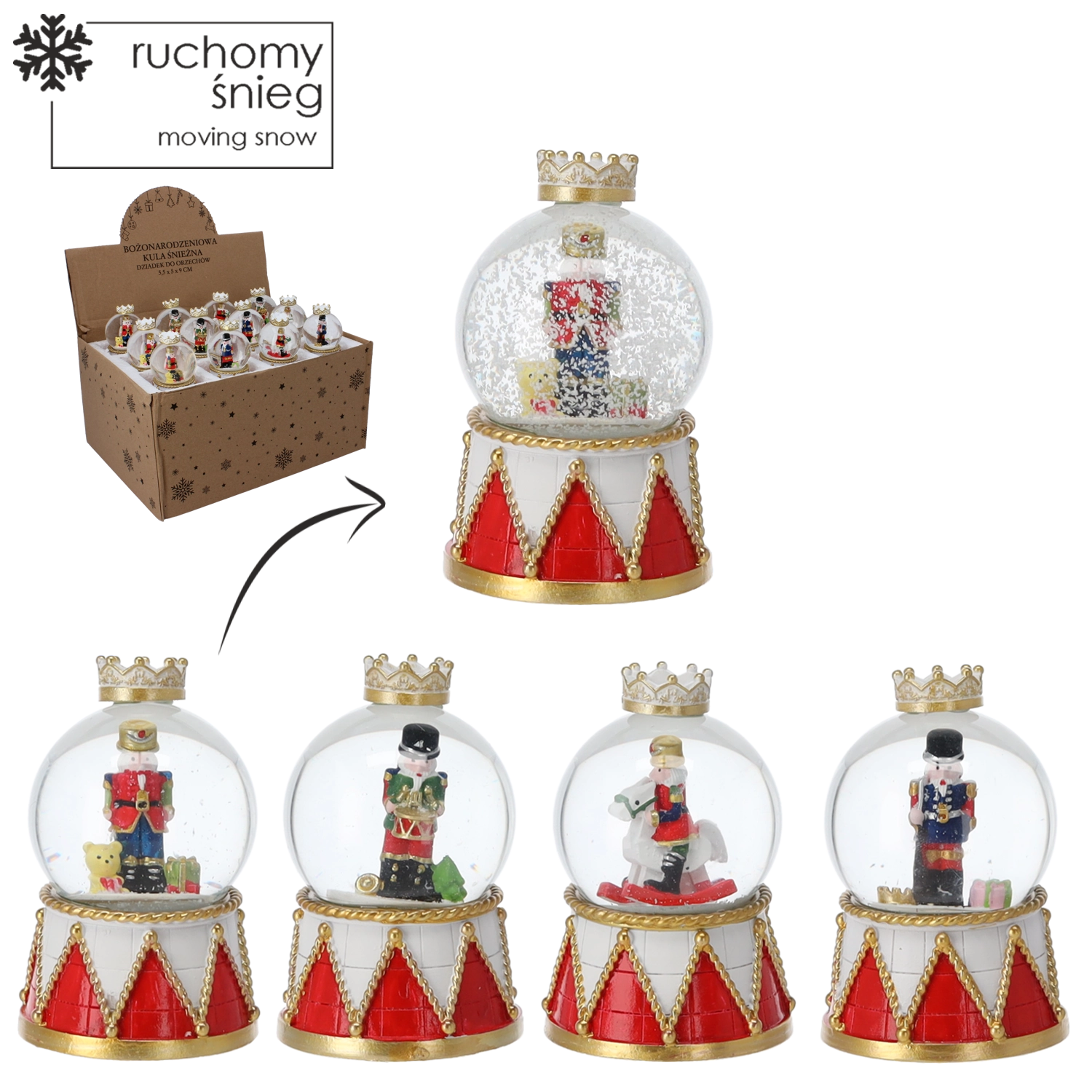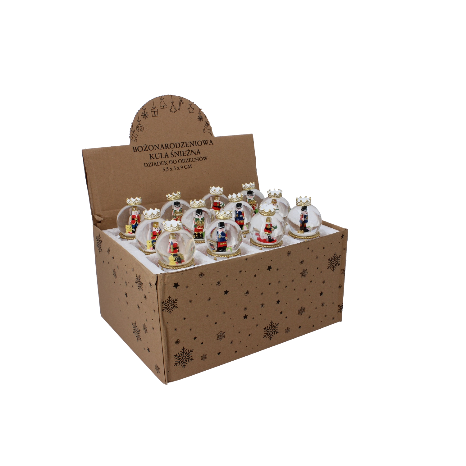 Hvert stykke prydes af en klar glaskuppel og en dekorativ sokkel i rød‑gylden trommedesign med krone. De kompakte mål gør den nem at placere på sofabord, hylde eller festbord. Takket være mixet af nøddeknækkermotiver kan du nemt matche kuglen med resten af pynten.