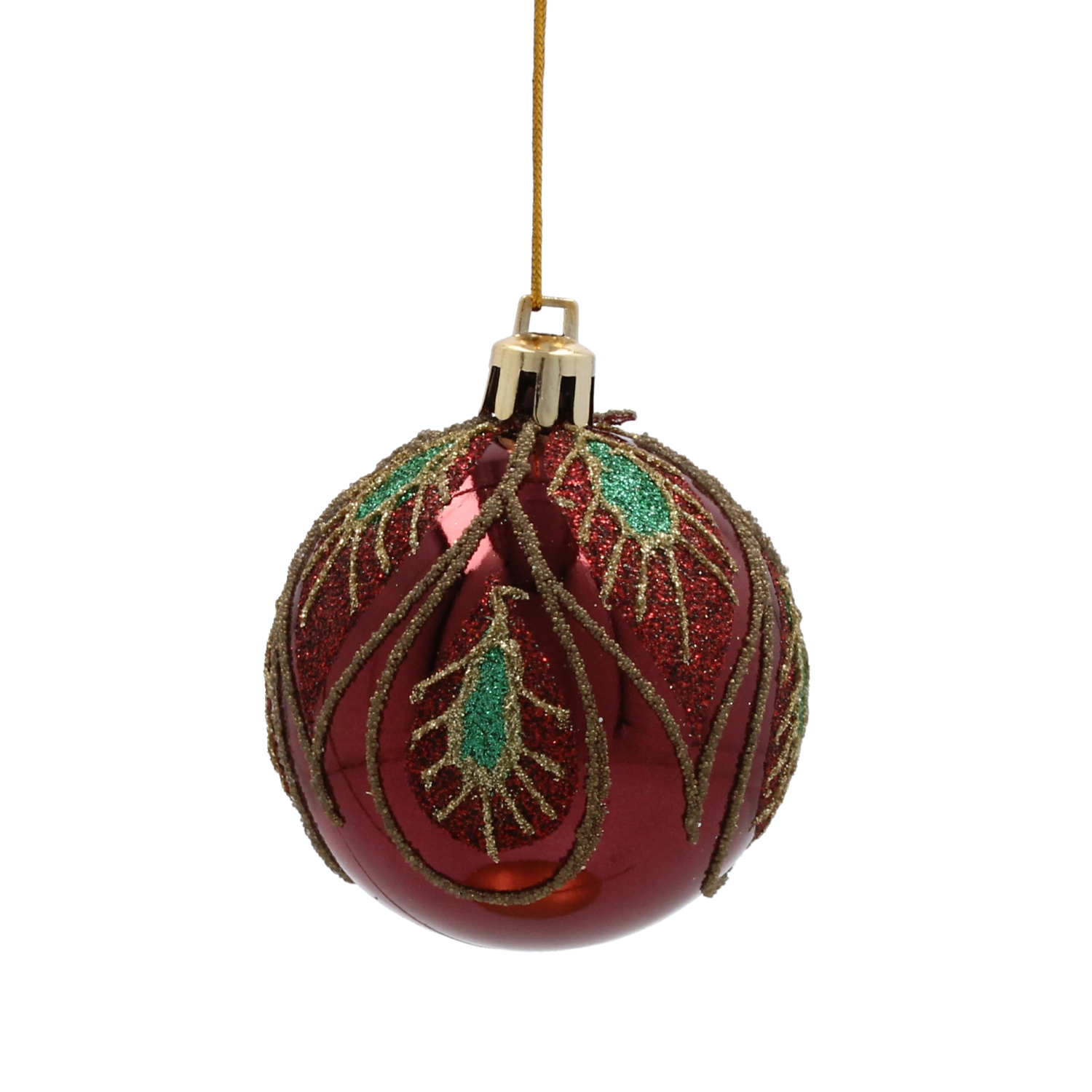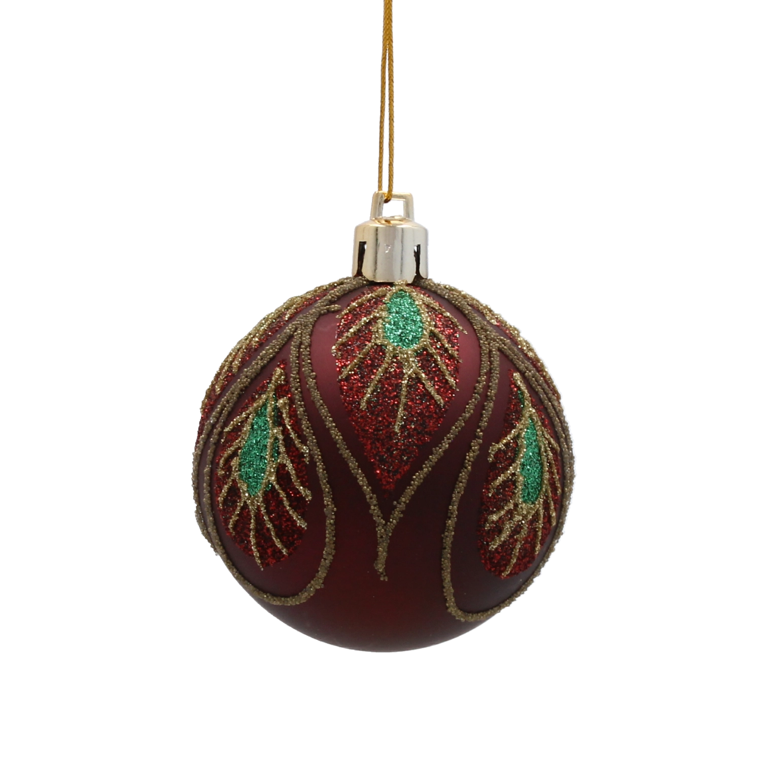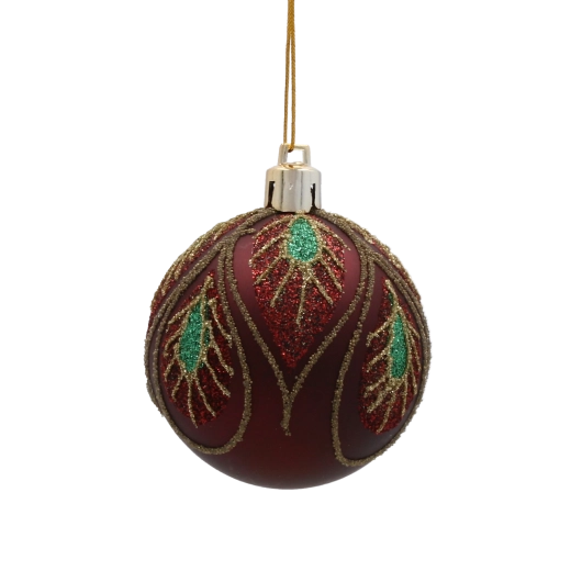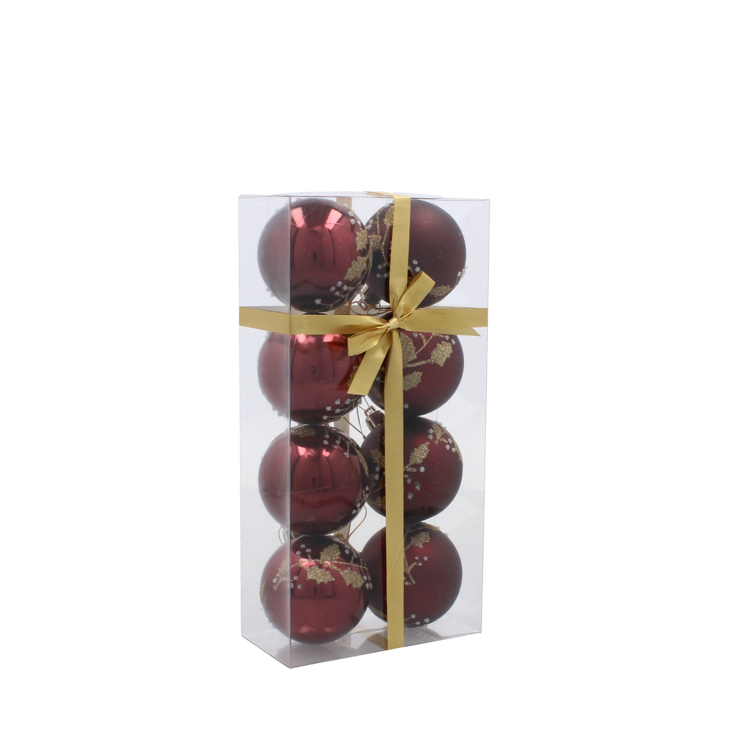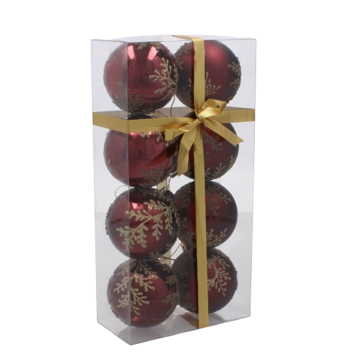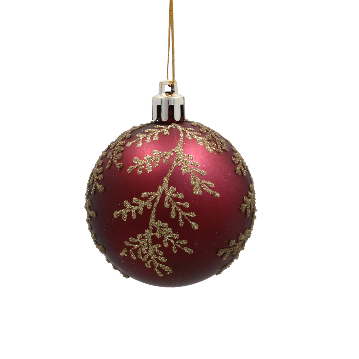 Dette stilfulde sæt pynt i en dyb burgundertone tilfører en varm og festlig accent til enhver indretning. Det fine gyldne bladmotiv virker luksuriøst og skaber sammen med den matte og blanke overflade et unikt lysspil på grenene af dit træ.