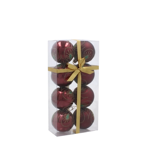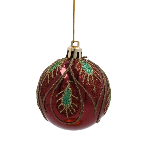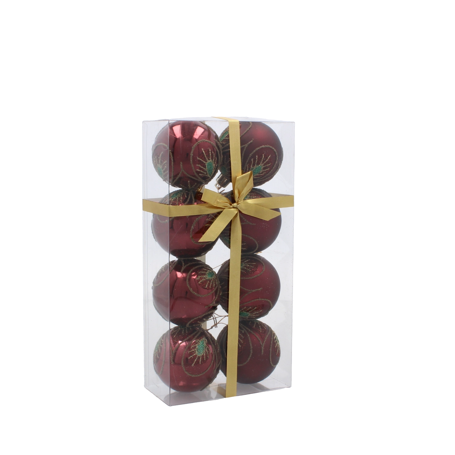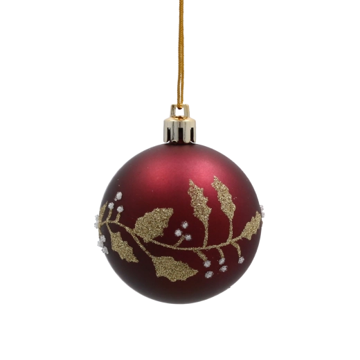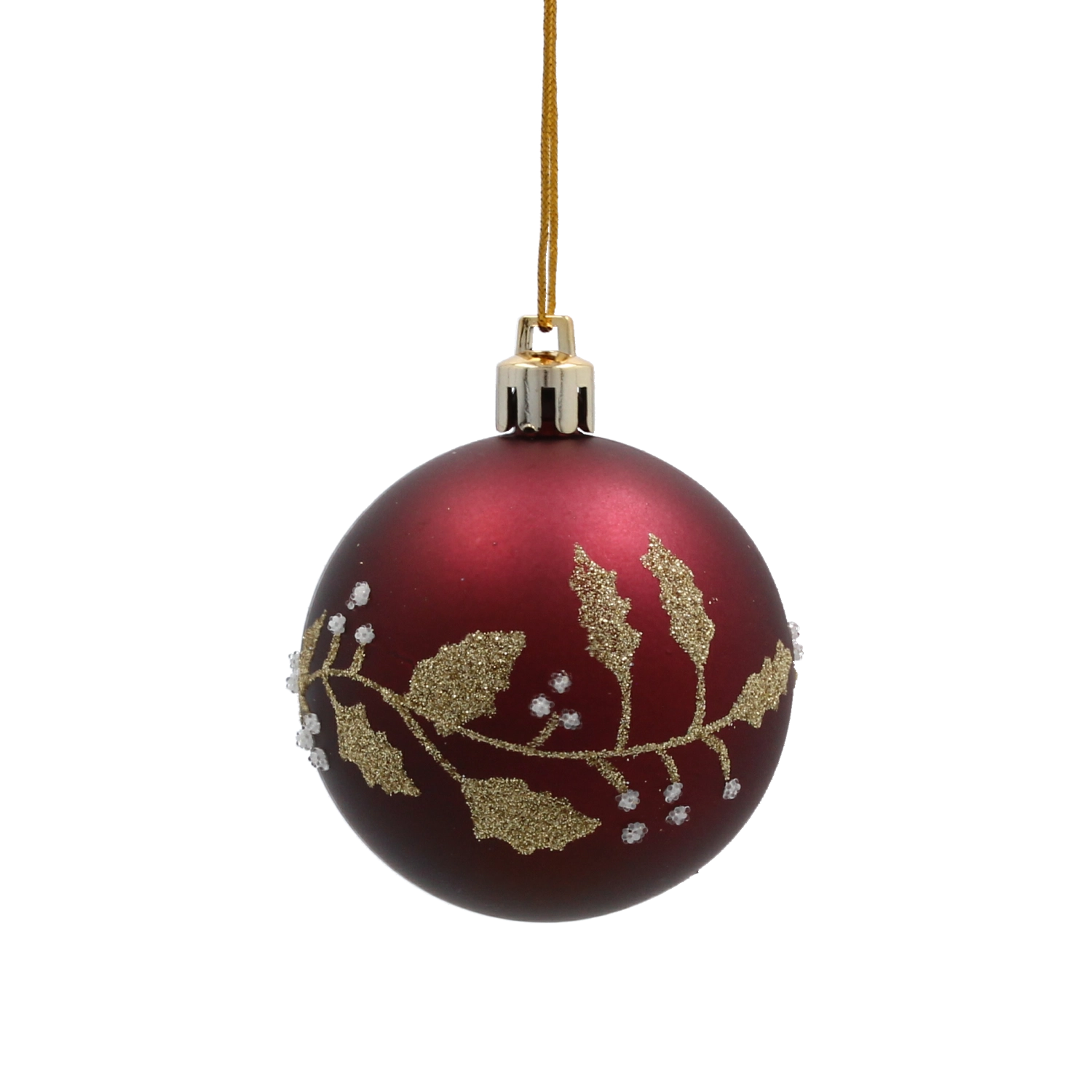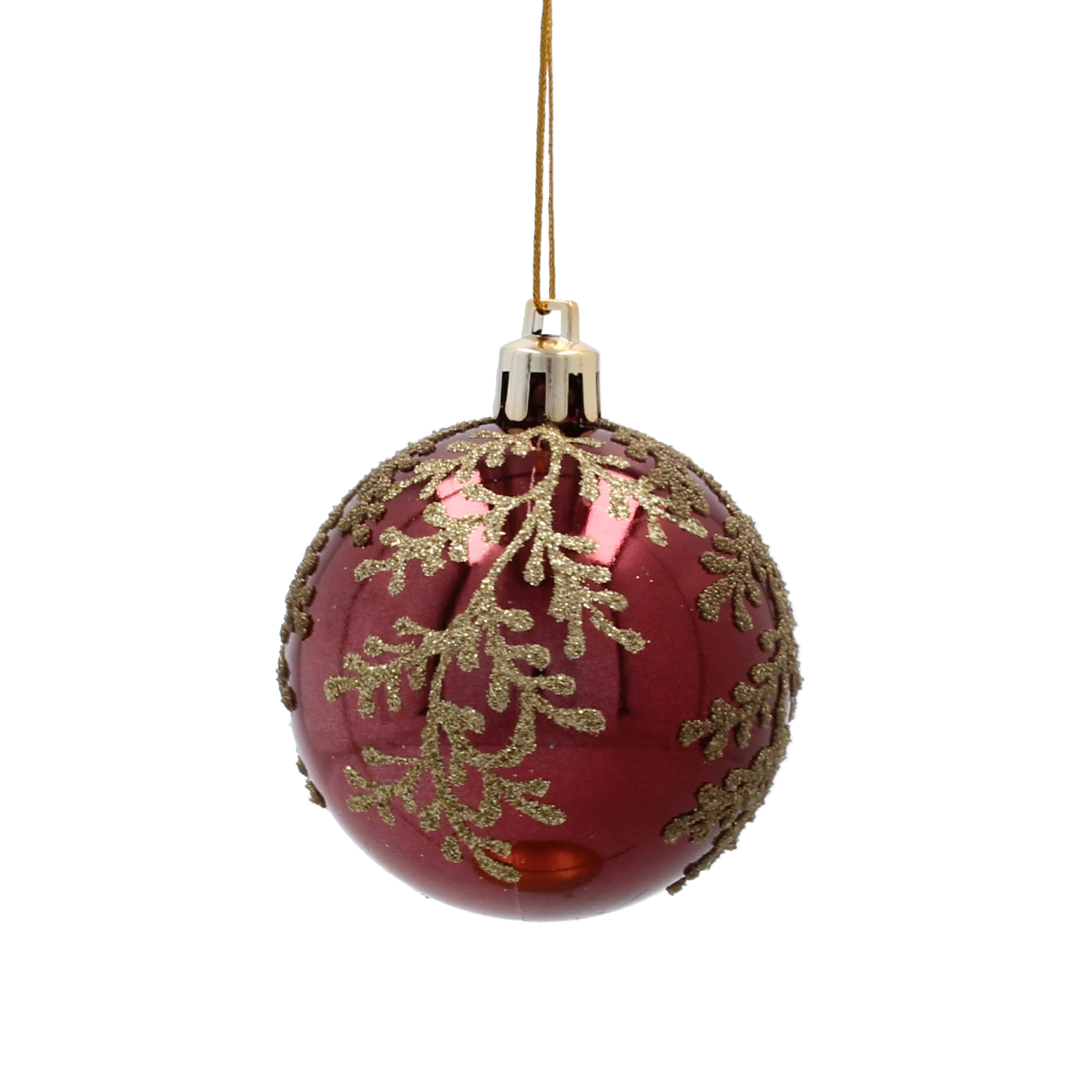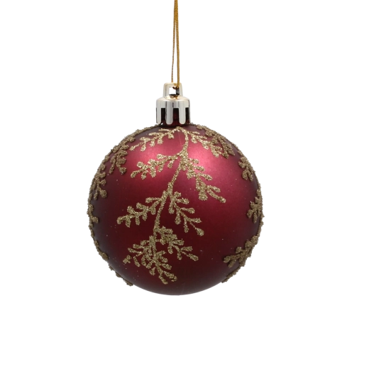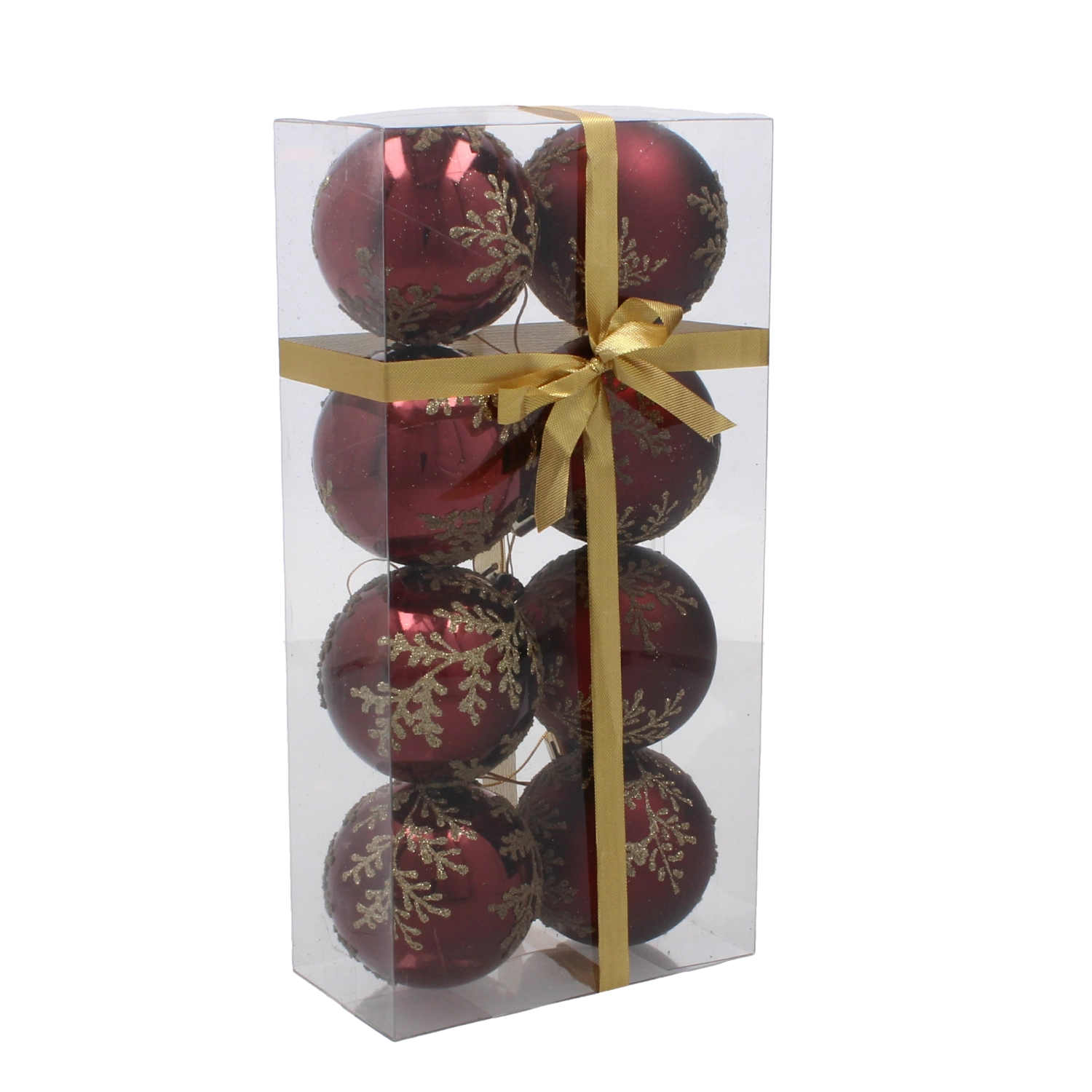 Skab ægte højtidstemning i hjemmet med et sæt på otte burgunderrøde julekugler med en diameter på 6 cm. Hver pynt i holdbar plast har et elegant gyldent bladmønster og en kombination af mat og blank overflade, som giver træet en sofistikeret glans og en harmonisk kontrast. Takket være det lette design er de nemme at hænge op og ideelle både til juletræet og til festlige dekorationer og kranse.