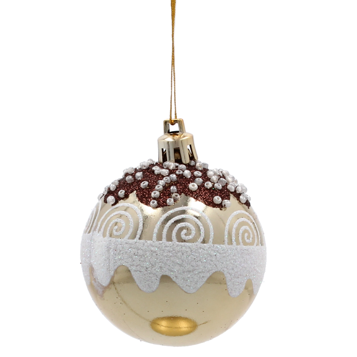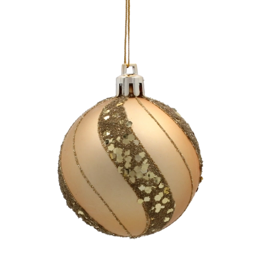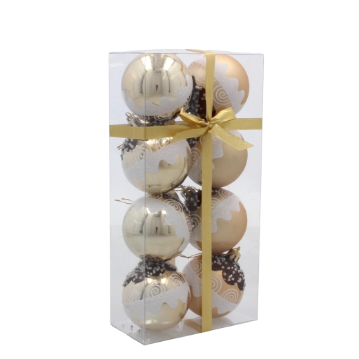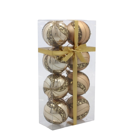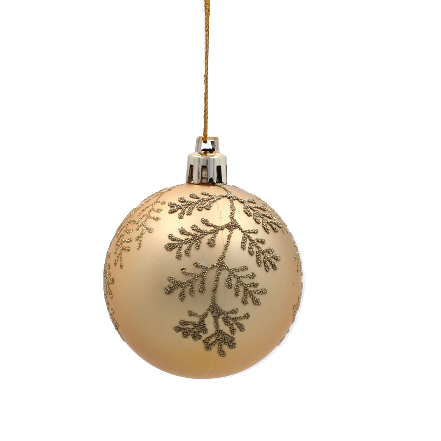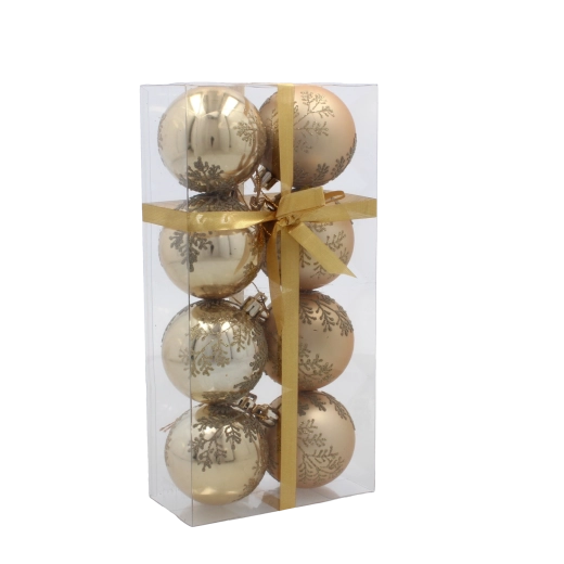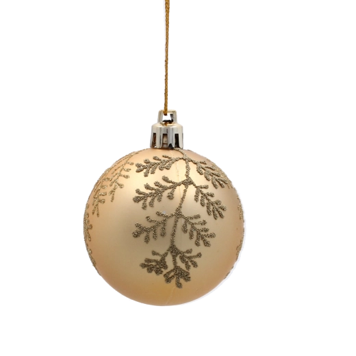 Giv dit juletræ et elegant udtryk med et sæt gyldne kugler med en diameter på 6 cm. Sættet indeholder 8 stk. i forskellige mønstre for en harmonisk udsmykning, fremstillet af splintfri plast for sikkerhed og holdbarhed. Hver kugle har en snor til nem ophængning, så pyntningen er hurtig og bekvem.