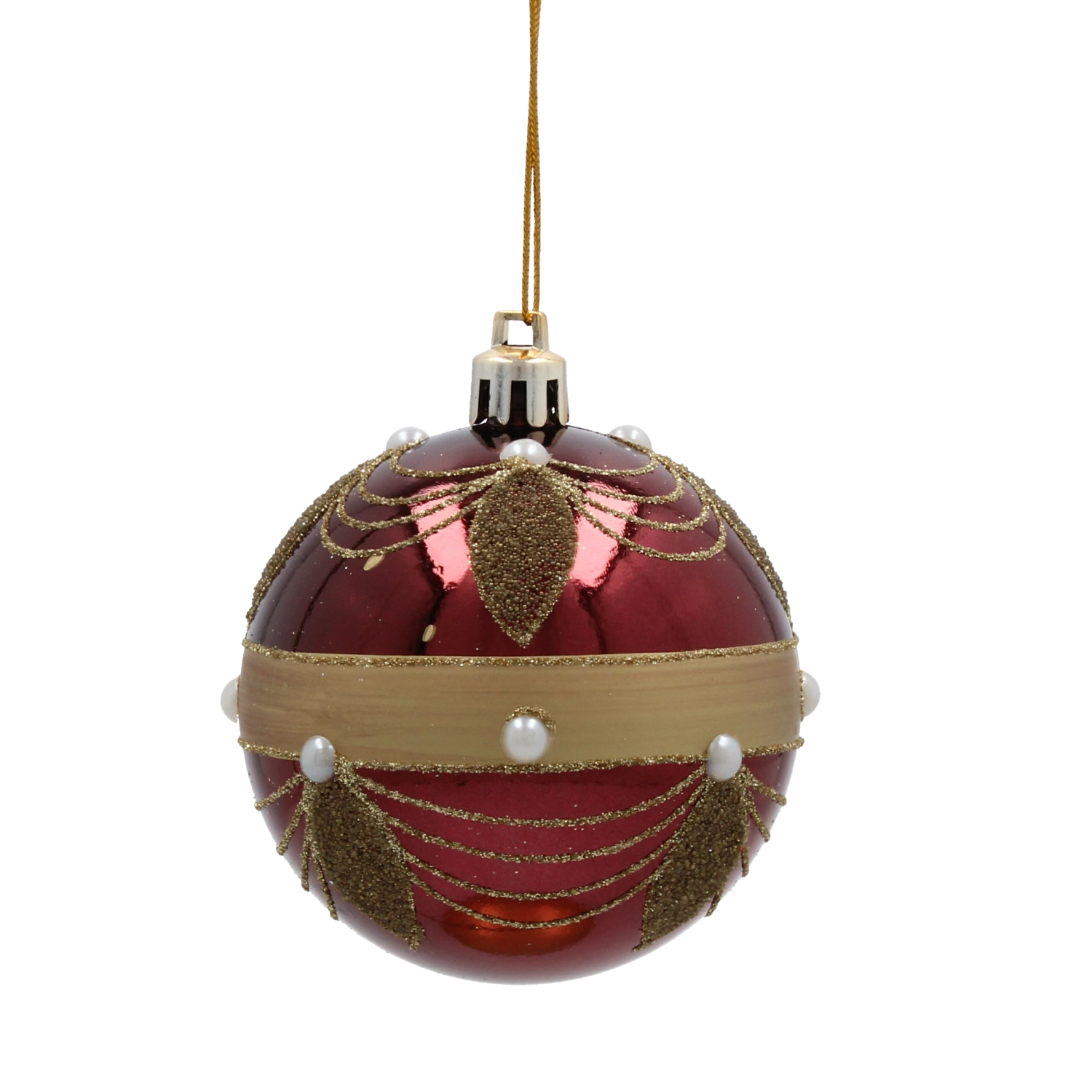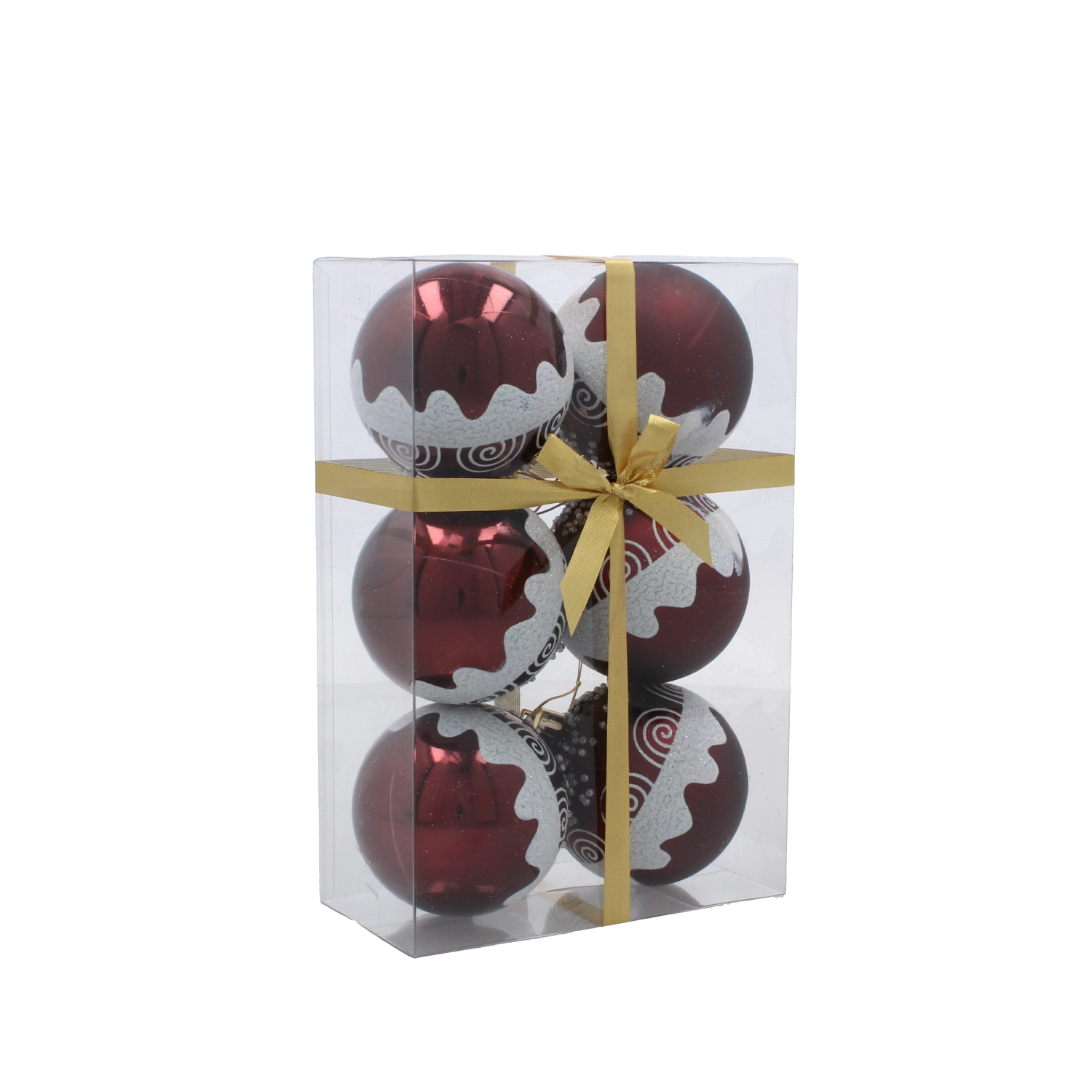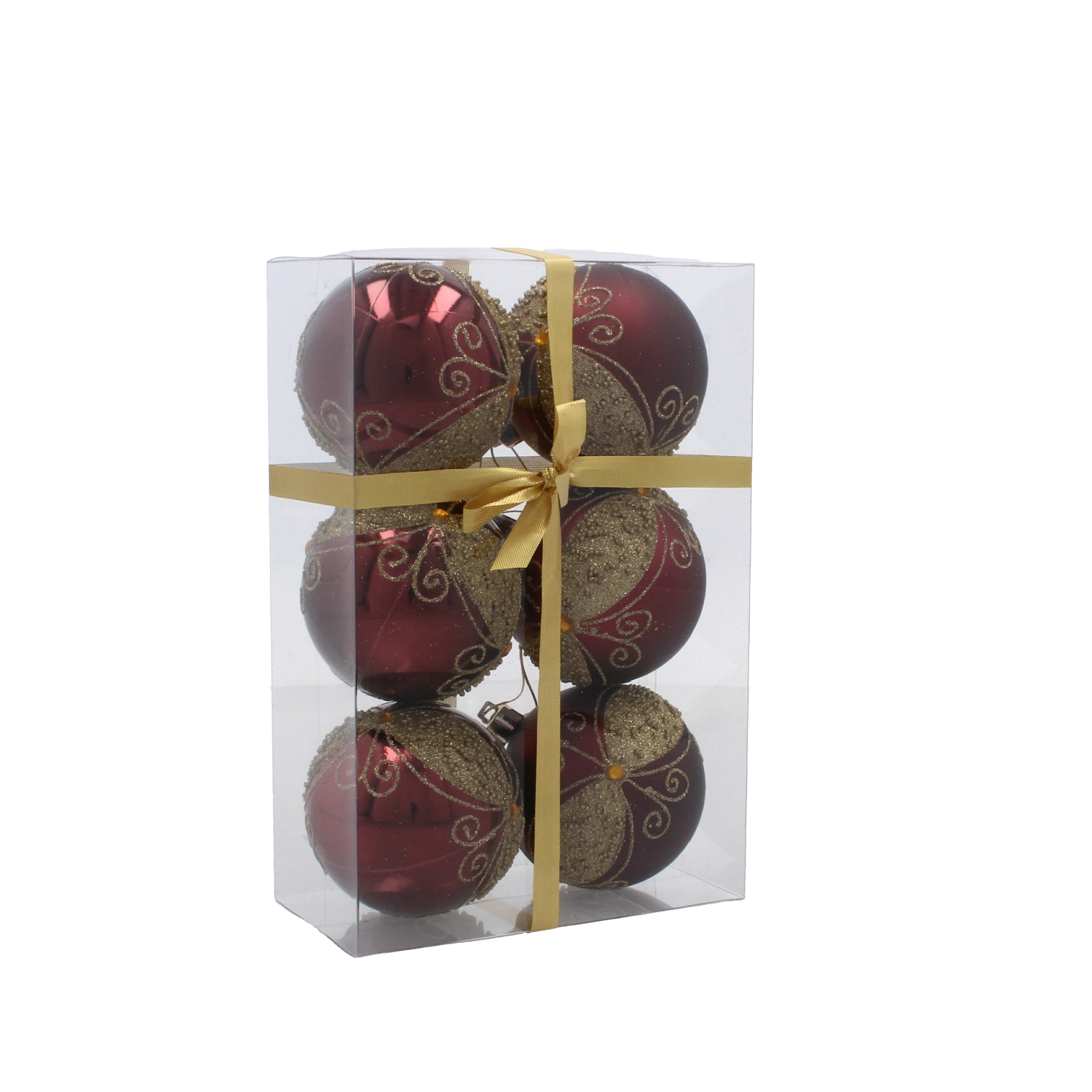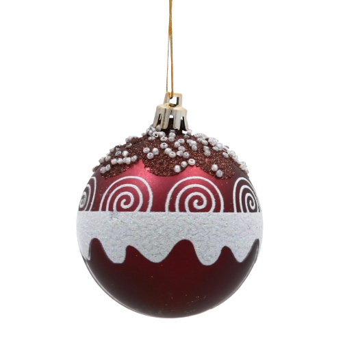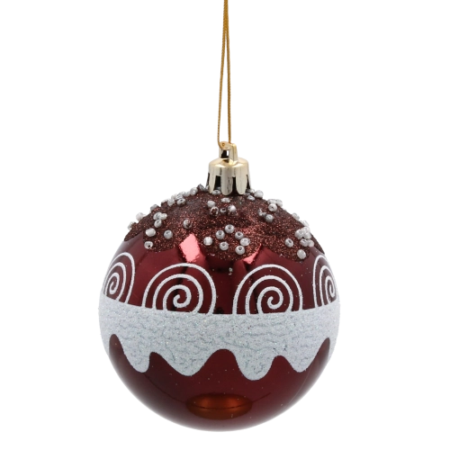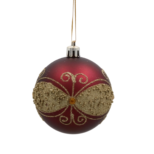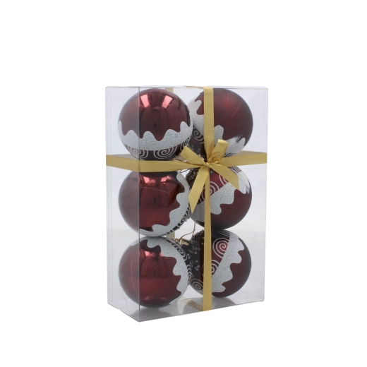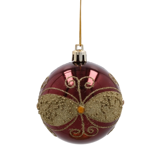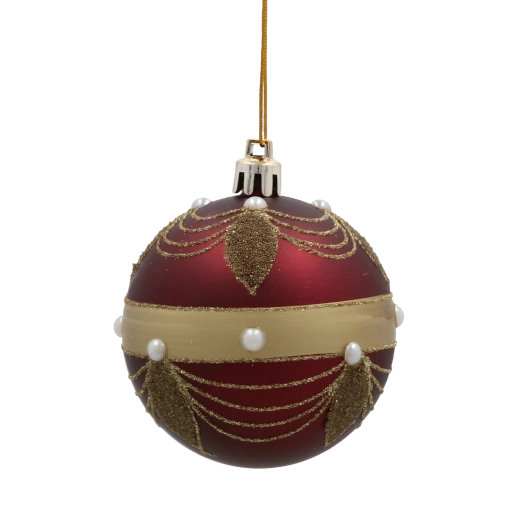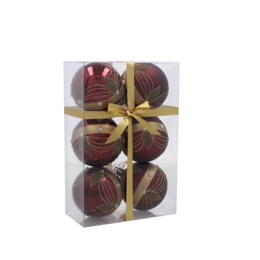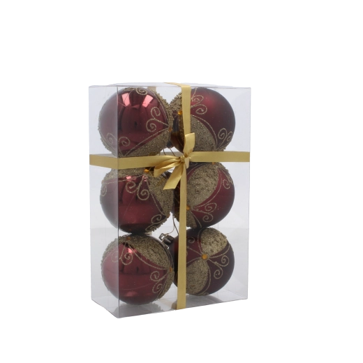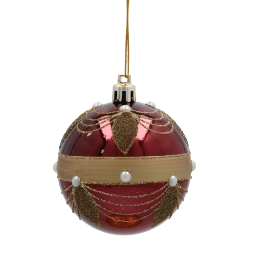 Giv dit hjem festligt skær med et sæt på seks kugler i dyb bordeaux. Hver kugle med en diameter på 7 cm er dekoreret med gyldne linjer, blade og hvide perler for et elegant, glamourøst udtryk. Fremstillet af brudsikker plast er de sikre for både børn og kæledyr, og takket være snore til nem ophængning kan de bruges både på træet og i andre julearrangementer.