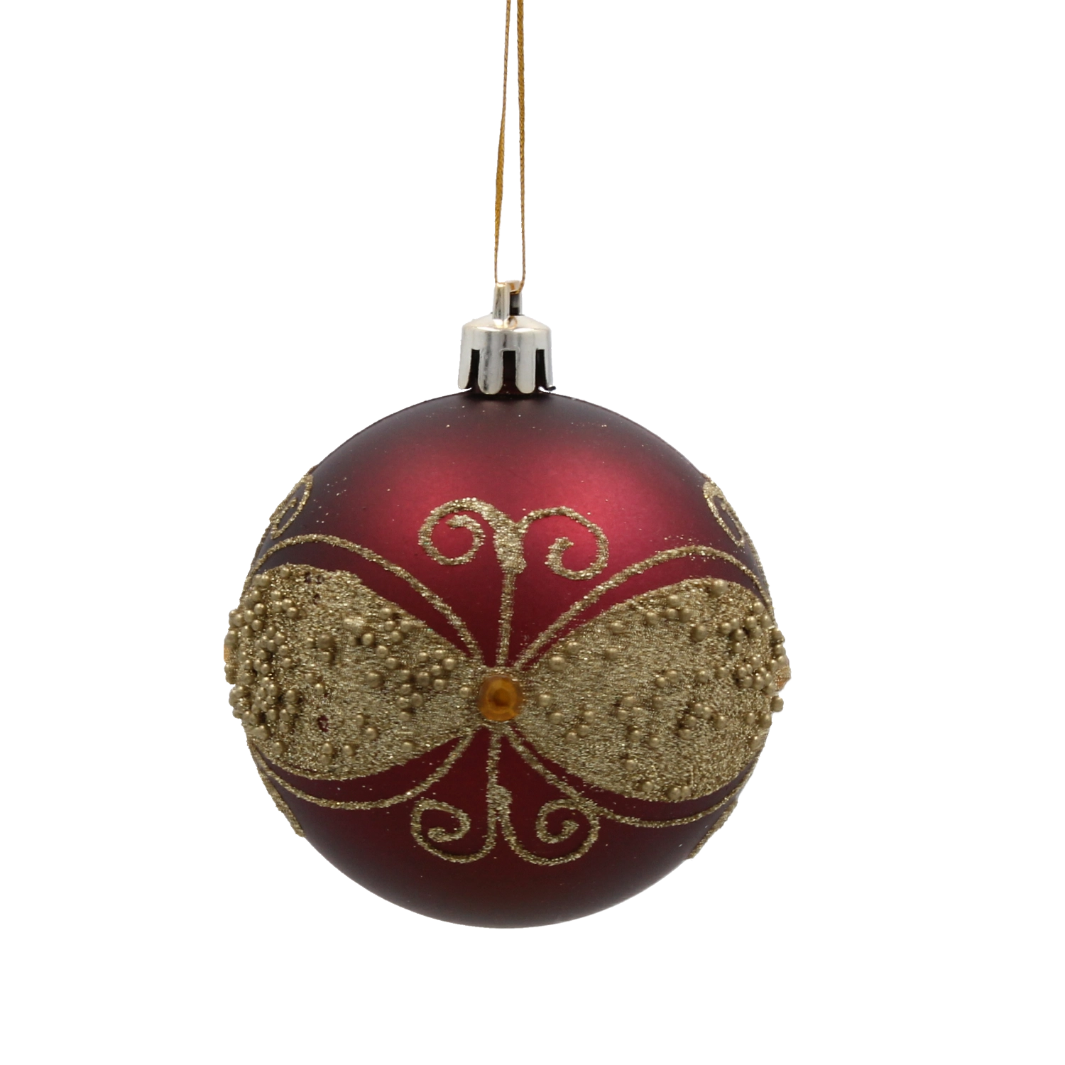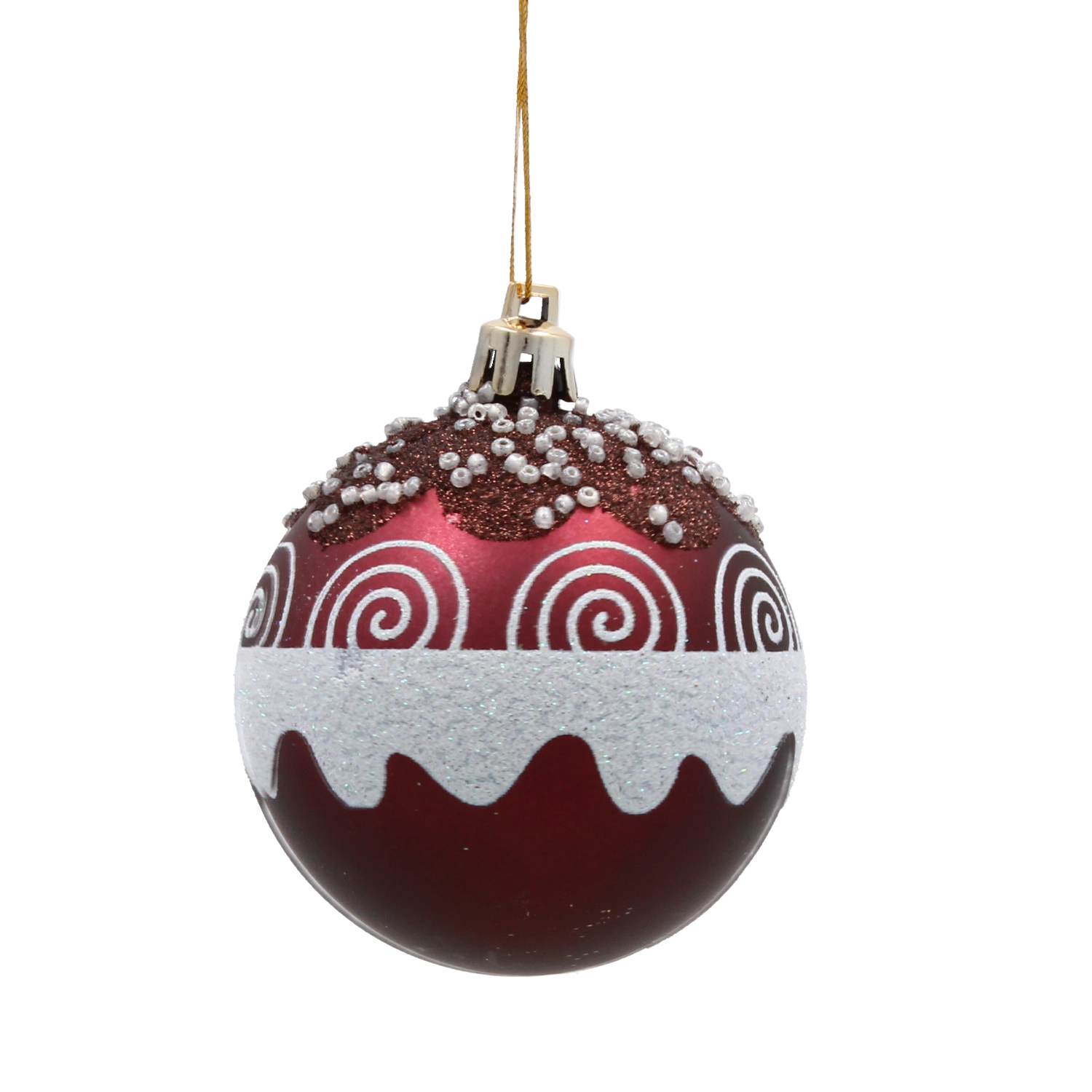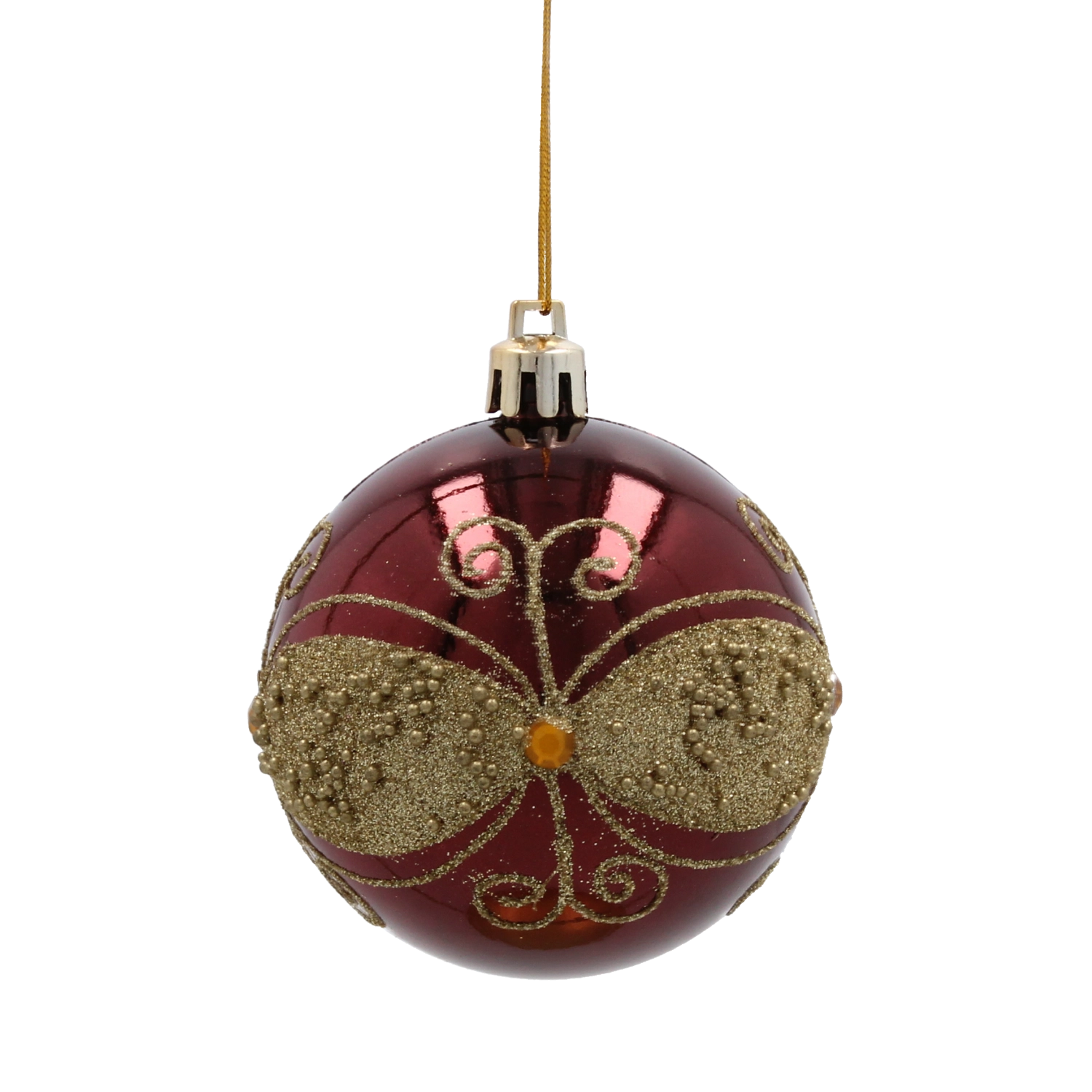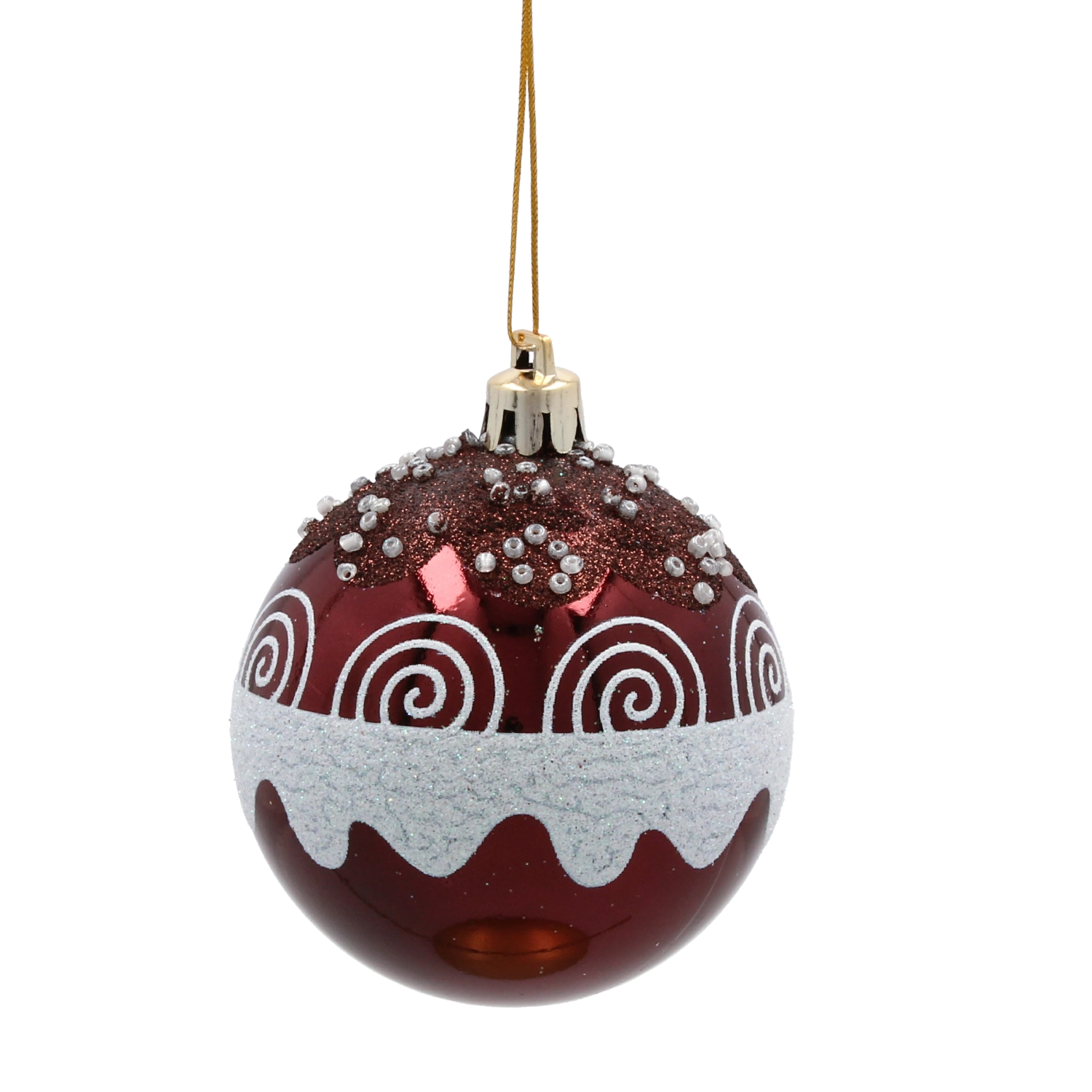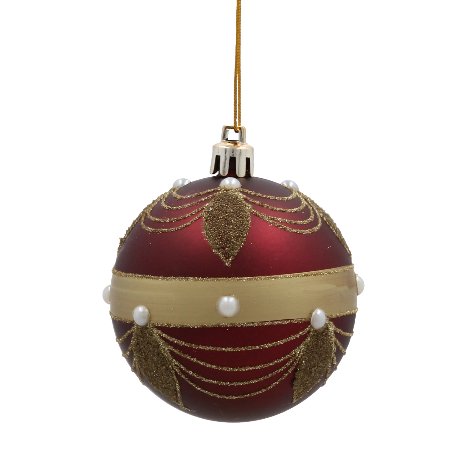 Giv dit hjem festligt skær med et sæt på seks kugler i dyb bordeaux. Hver kugle med en diameter på 7 cm er dekoreret med gyldne linjer, blade og hvide perler for et elegant, glamourøst udtryk. Fremstillet af brudsikker plast er de sikre for både børn og kæledyr, og takket være snore til nem ophængning kan de bruges både på træet og i andre julearrangementer.
