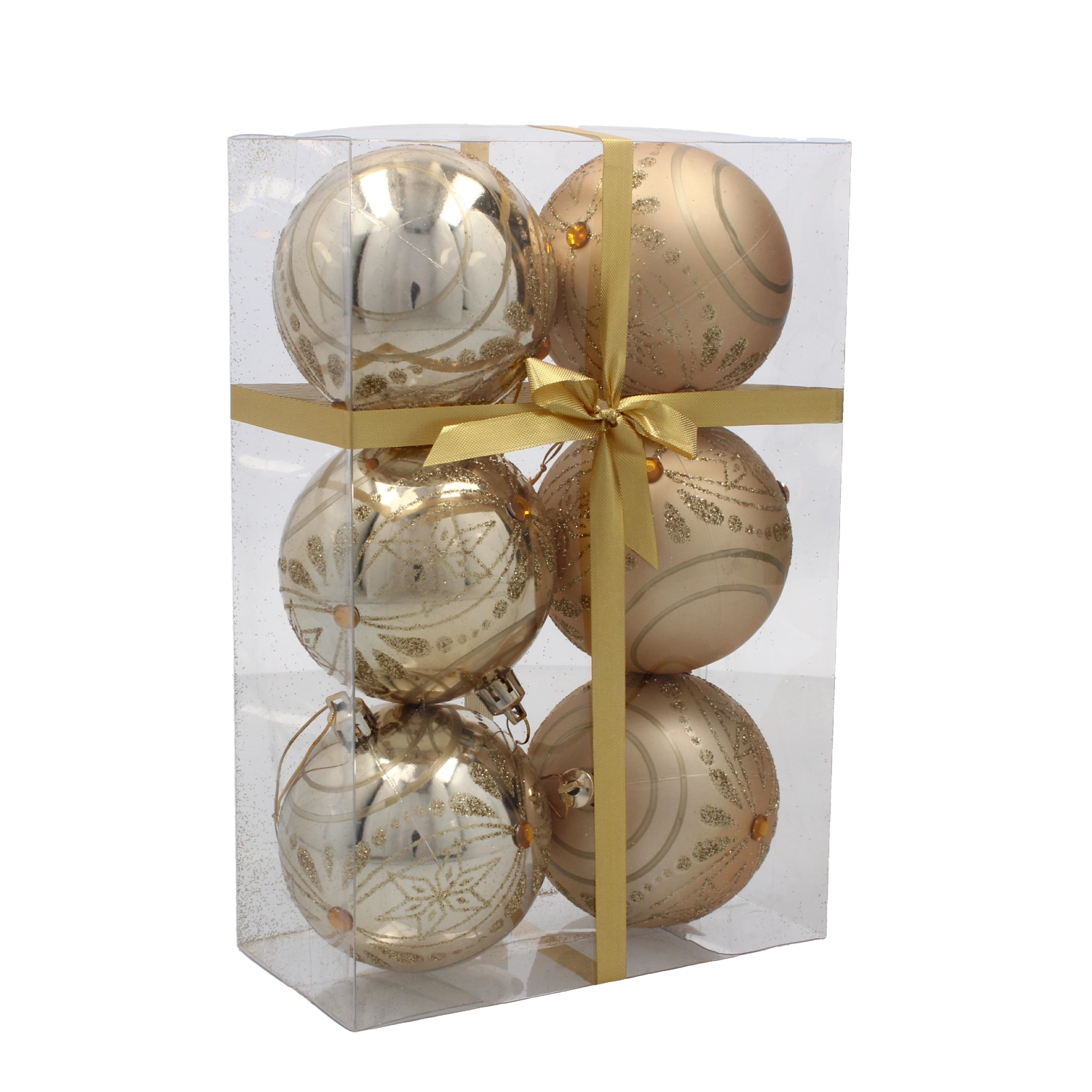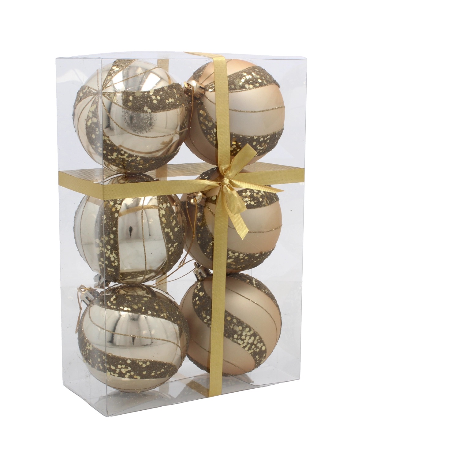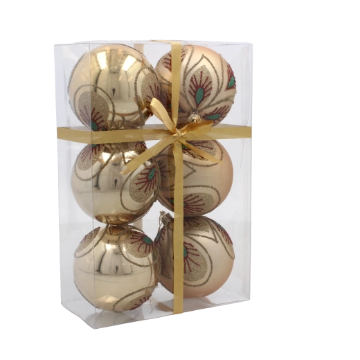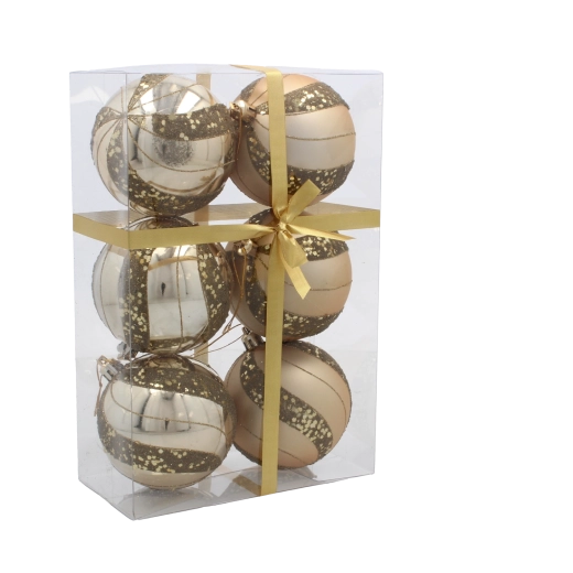 Giv din jul et sofistikeret præg. Dette koordinerede sæt kugler i guld- og champagnetoner byder på en afbalanceret kombination af glans, mat og glimmer. Mønstre med fine linjer, glitrende elementer og påfugleøje-motiv skaber iøjnefaldende reflekser, som ser smukt ud på både traditionelle og moderne træer.