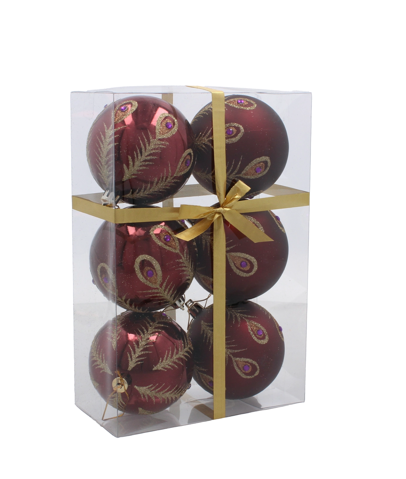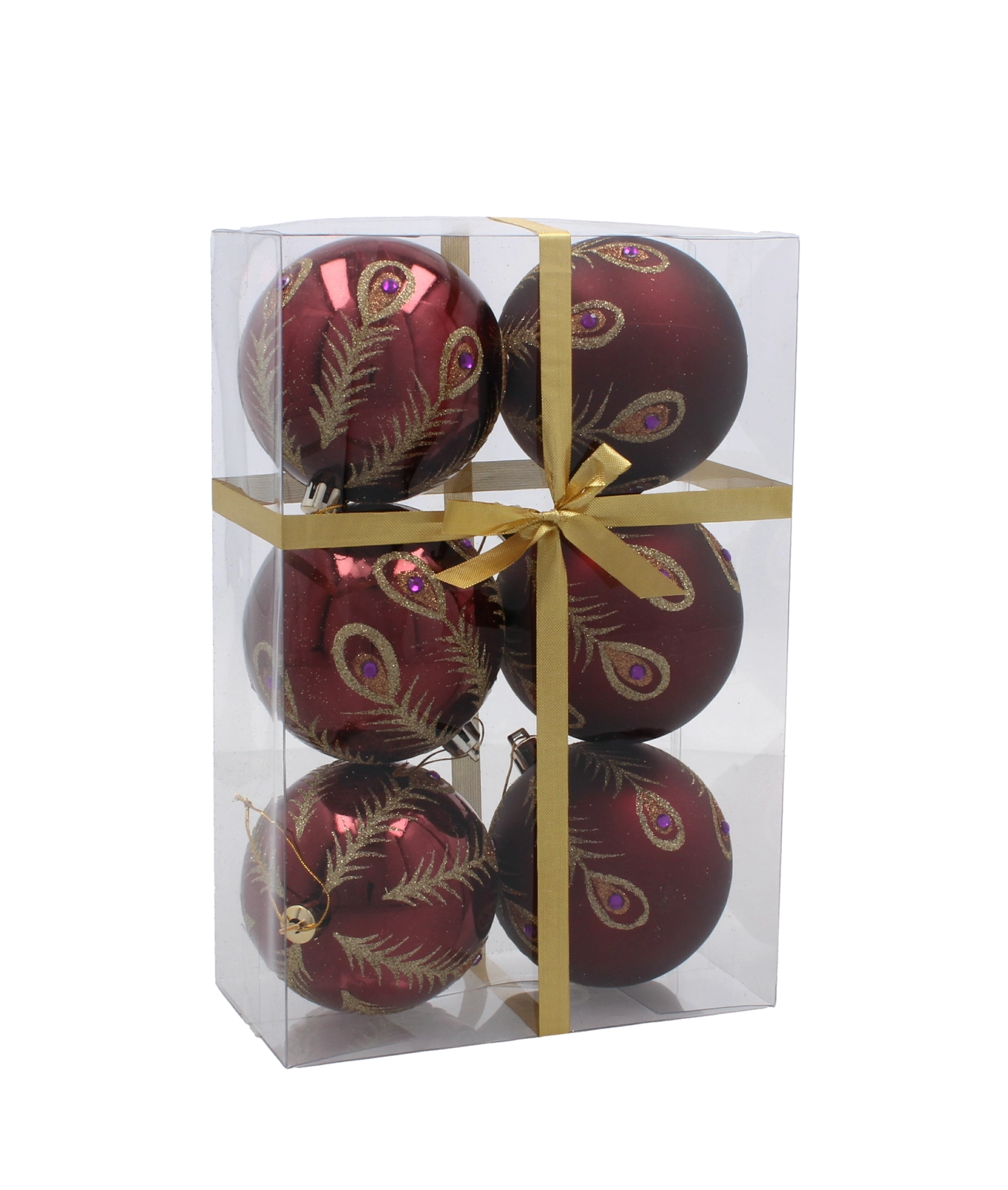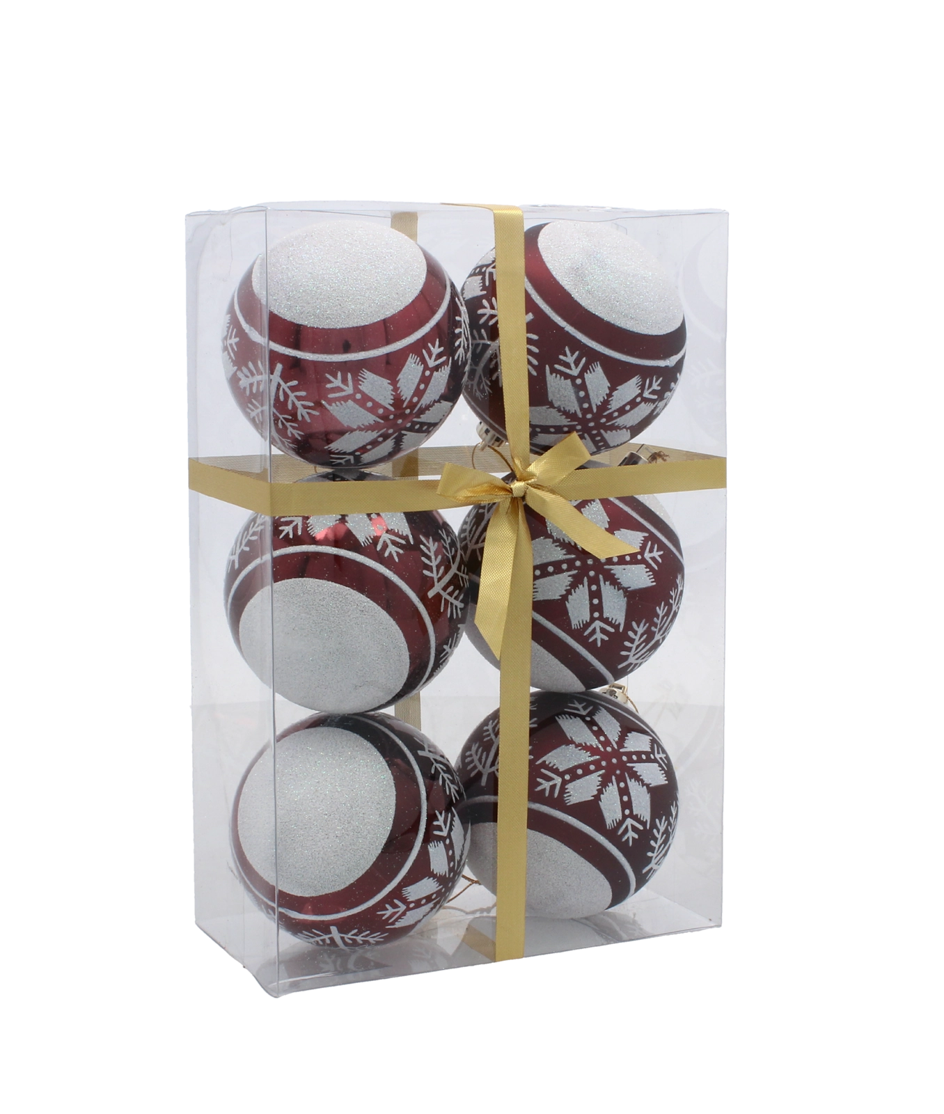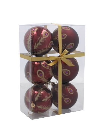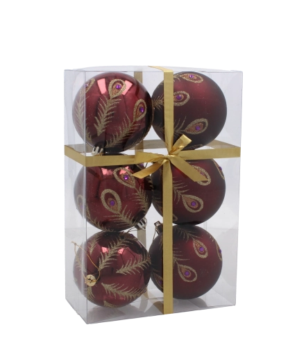 Dette sæt indeholder 6 nøje afstemte ornamenter i en dyb bordeauxfarve. Hver kugle er dekoreret med fine gyldne motiver og kombinerer matte og blanke overflader for en markant kontrast og festlig glans. Den universelle diameter på 8 cm passer til både mindre og større træer og er nem at kombinere med øvrig pynt.
