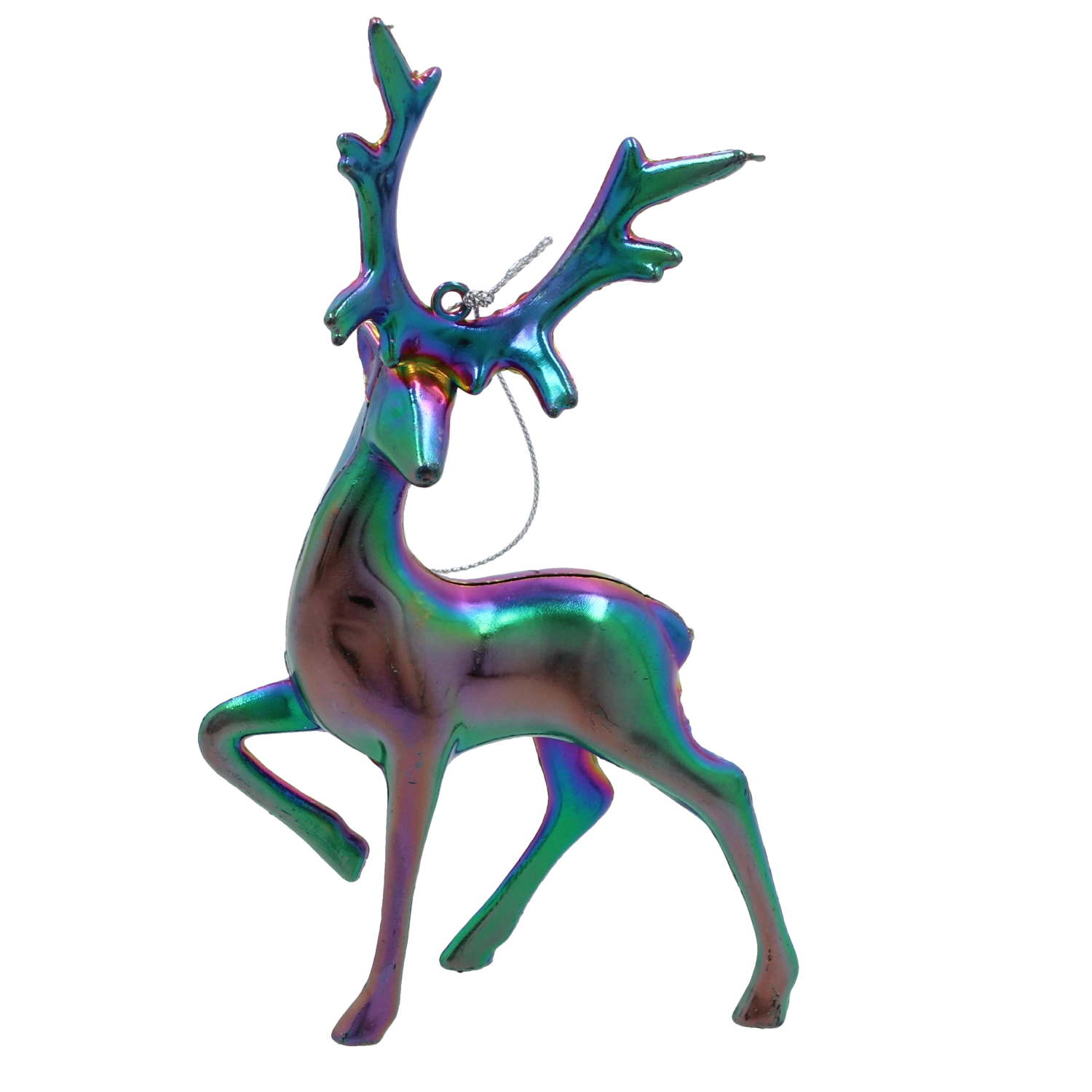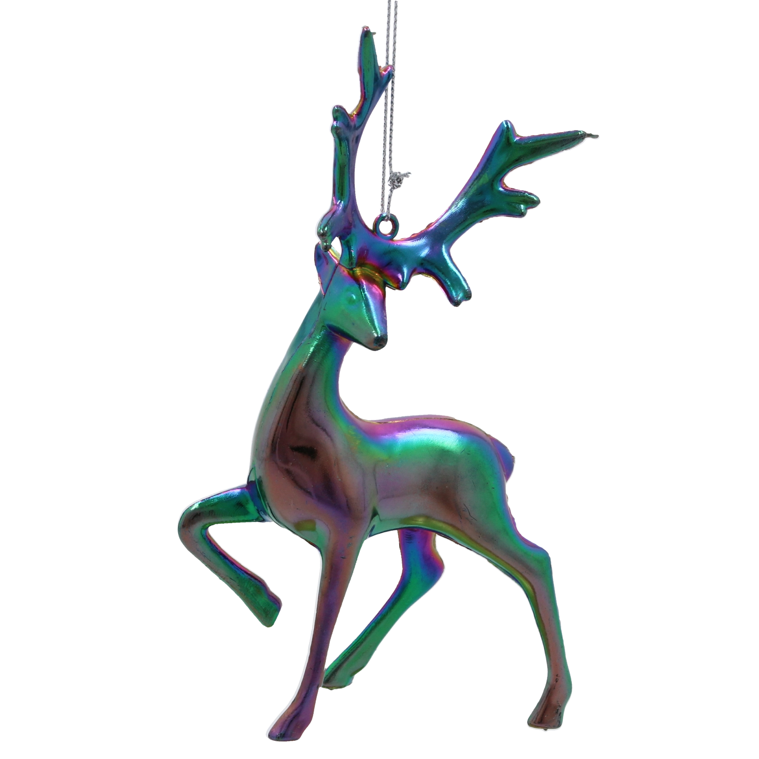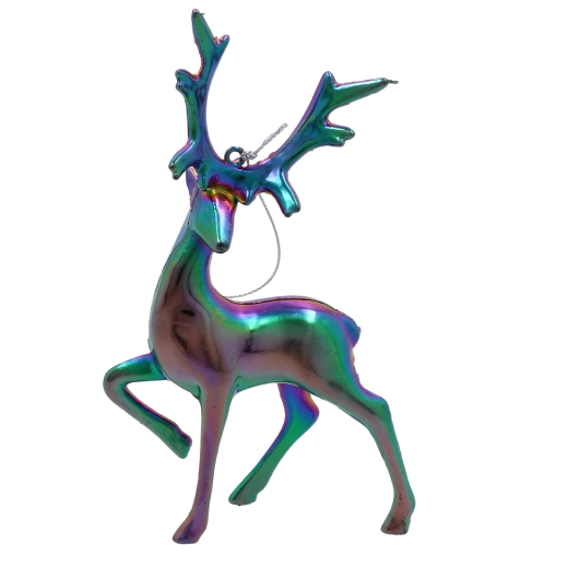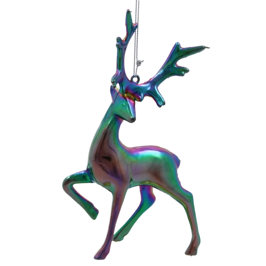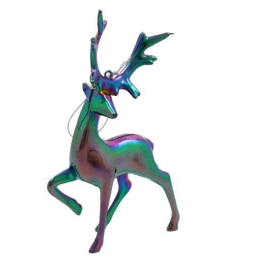 Denne designpynt i rensdyrform kendetegnes ved en glat, blank overflade med iriserende – “olieagtig” effekt, der skifter alt efter lysindfald fra lilla over grøn til blå nuancer. Takket være det skiftende skær virker den på træet som en iøjnefaldende, men stilfuld accent.