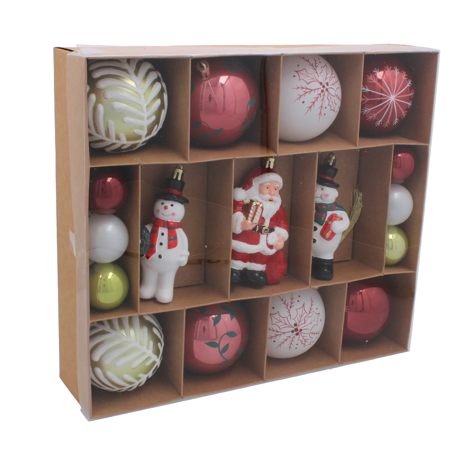 Stilfuldt sæt med 23 julepynt i en blanding af former og farver, der giver dit hjem en helt særlig festlig stemning. Holdbar blank plast, forskellige former (engel, kugle, snefnug) og nuancer af rød, hvid og guld passer nemt til enhver dekoration. Hver pynt har en ophængssnor for nem placering på træ, krans eller anden dekoration, og sættet er pakket i en dekorativ æske for sikker opbevaring.