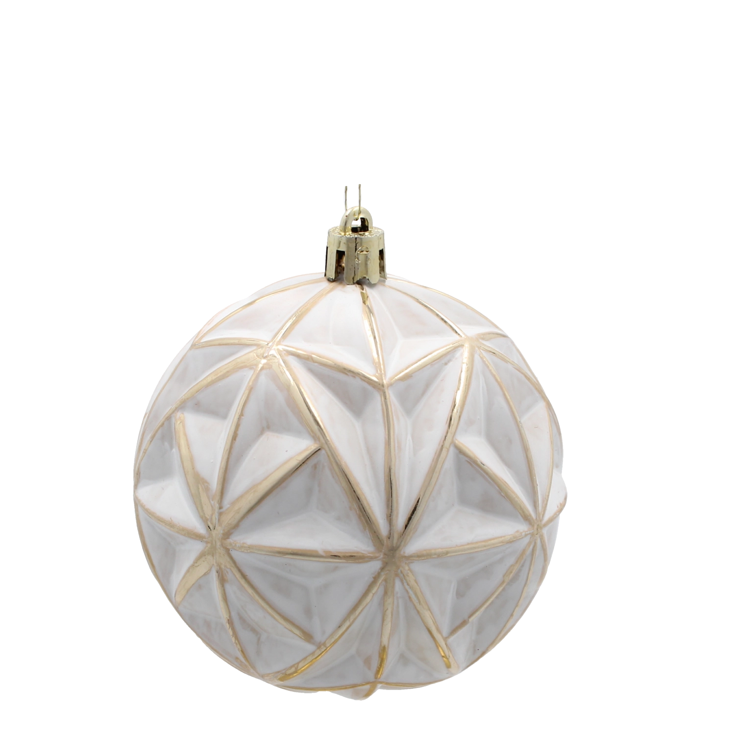 Sættet kombinerer højglans-kugler og ornamenter med geometrisk mønster for en effektfuld lysrefleksion og visuel dybde.