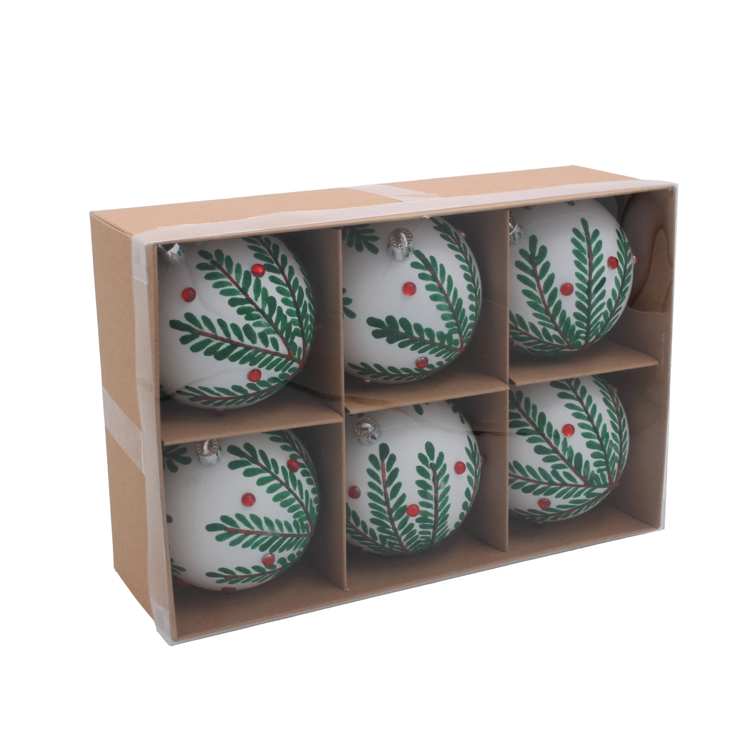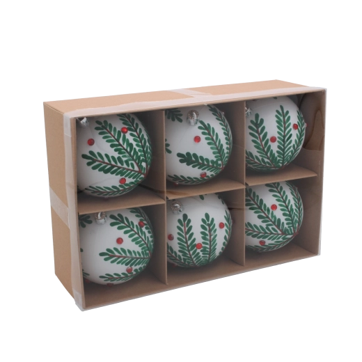 Giv dit træ et strejf af elegance med et sæt på seks hvide julekugler med en diameter på 8 cm. Hver pynt er dekoreret med fine grene for et naturligt og sofistikeret udtryk. Takket være det minimalistiske design passer de nemt til både traditionel og moderne udsmykning. Den lette og holdbare konstruktion sikrer nem håndtering og lang levetid.