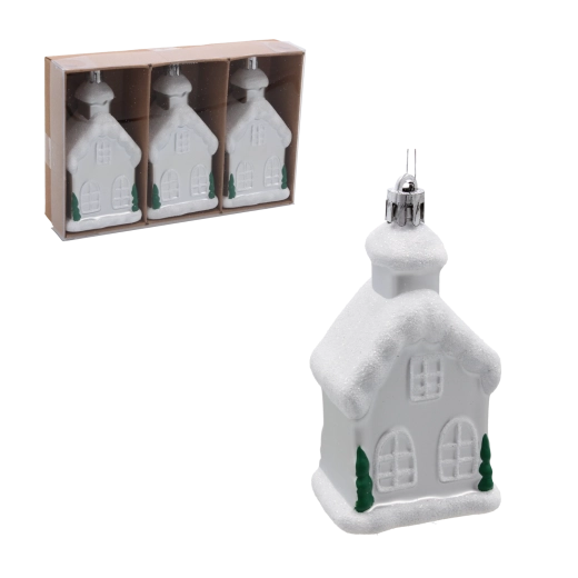Skab en eventyrlig stemning derhjemme med et sæt på tre juleornamenter formet som små huse, 9 cm høje. Ornamenterne af let plast er slagfaste og brudsikre, har fine detaljer og glitrende accenter, der smukt reflekterer lyset. Ideelle til familier med børn og kæledyr og perfekte til både traditionel og moderne pynt.