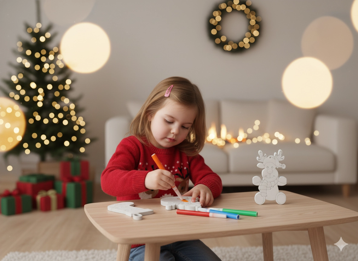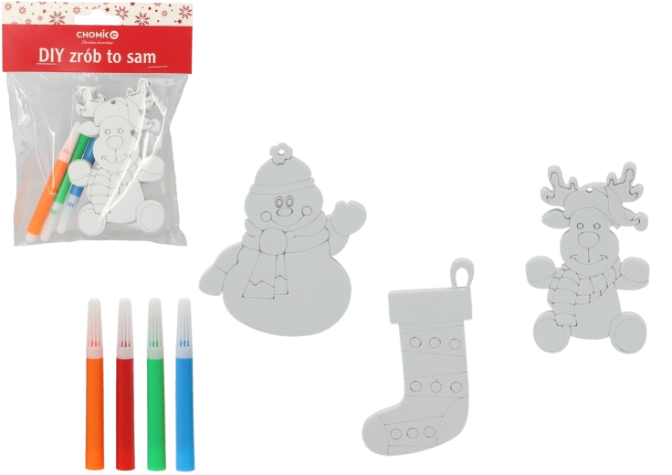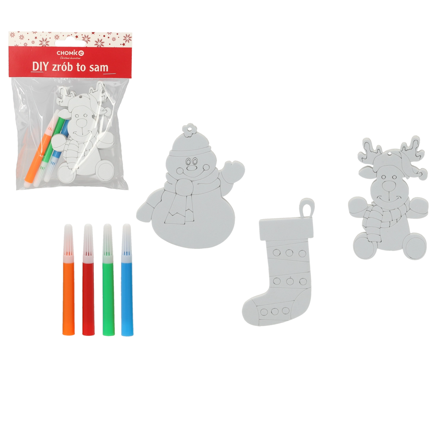 Skab din egen julemagi! Dette kreative sæt indeholder 3 hængende pynt til farvelægning – en snemand, et rensdyr og en julestrømpe – samt 4 farvede tuscher. Det lette materiale er ideelt til børn, er nemt at dekorere, og de færdige pynt kan blot hænges på træet, i vinduet eller på gaver. Perfekt sjov for hele familien og smuk DIY-julepynt.