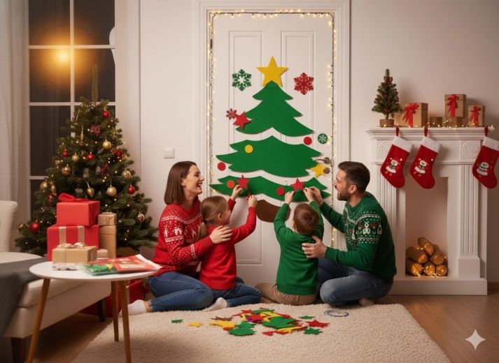 Takket være den enkle montering (velcro eller klistermærker) beskadiger dekorationen ikke overflader og er velegnet til døre og glatte vægge. Det holdbare filt bevarer formen og muliggør genbrug i mange sæsoner.