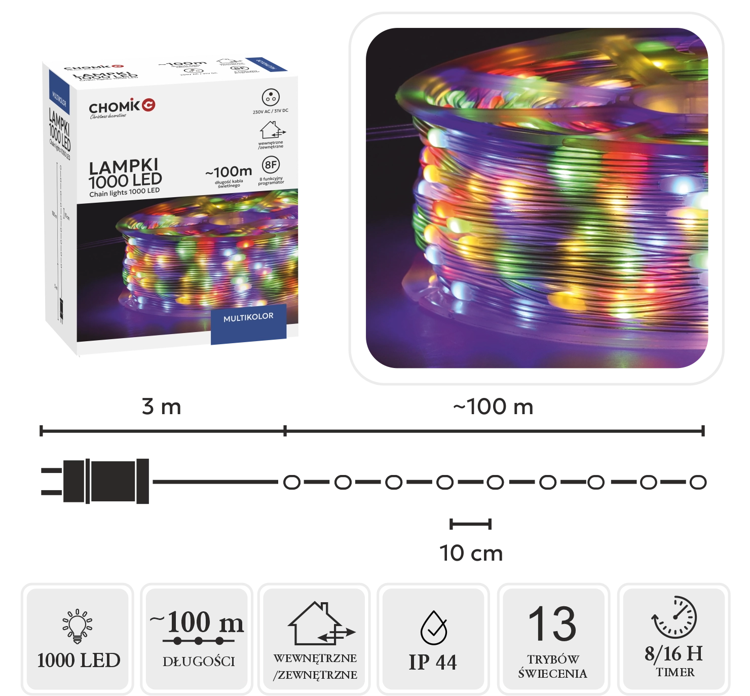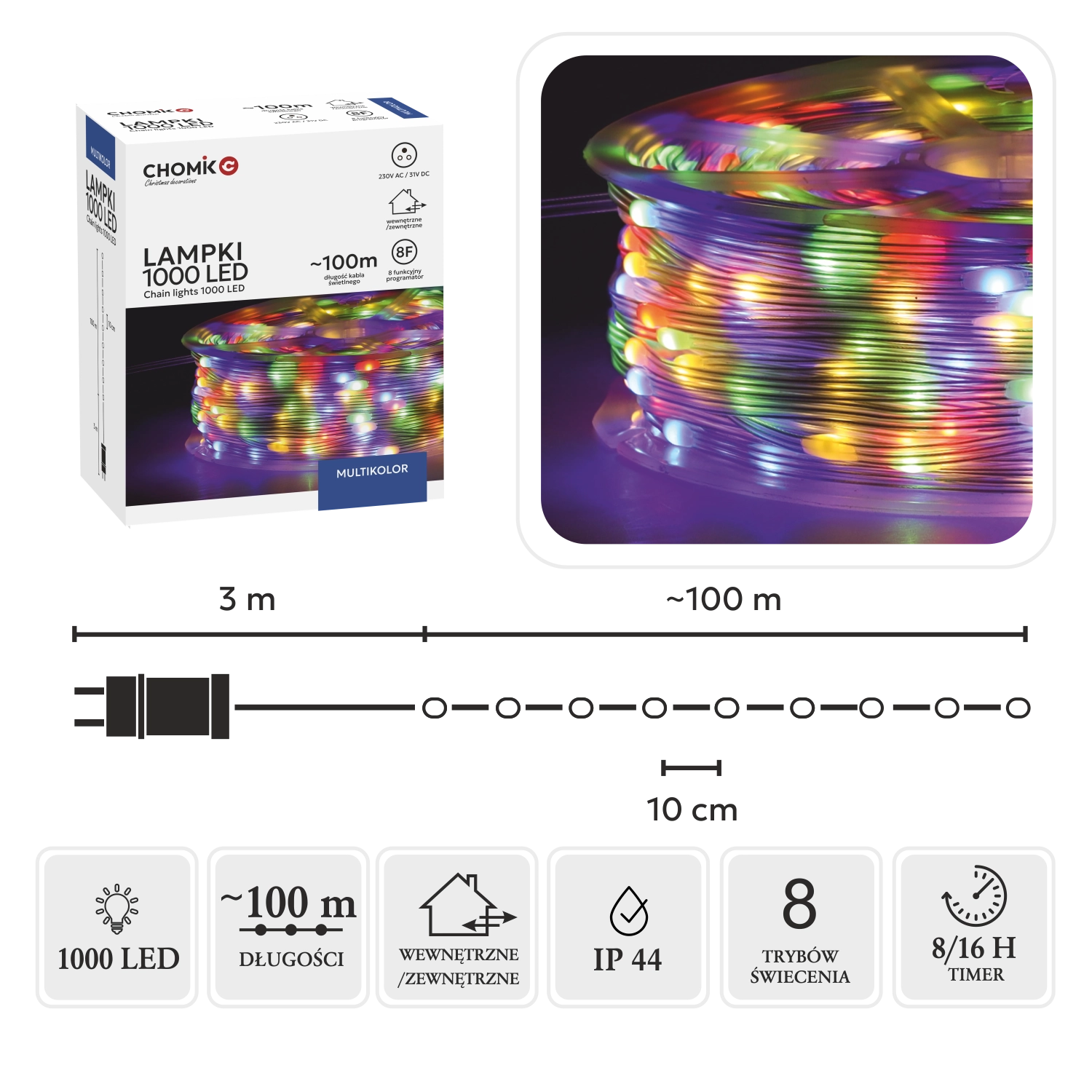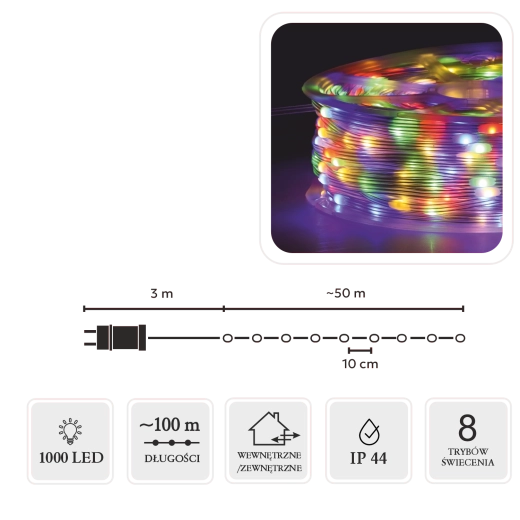 Den praktiske controller med 8 funktioner har hukommelse for sidste indstilling og en 8/16 t timer til automatisk tænd/sluk. Spole i pakken gør håndtering, opbevaring og genbrug nemt. Med IP44 er kæden egnet til indendørs brug og beskyttede udendørsområder.