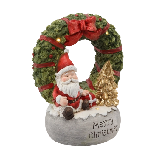 Denne elegante julefigur bringer en varm atmosfære til indretningen. Den dekorative krans med JULEMAND og teksten ”Merry Christmas” er suppleret med blidt LED-lys, som fremhæver detaljerne og skaber hyggelig belysning på en hylde, kommode eller vindueskarm. Det kvalitetsrige magnesiamateriale sikrer holdbarhed og lang levetid.