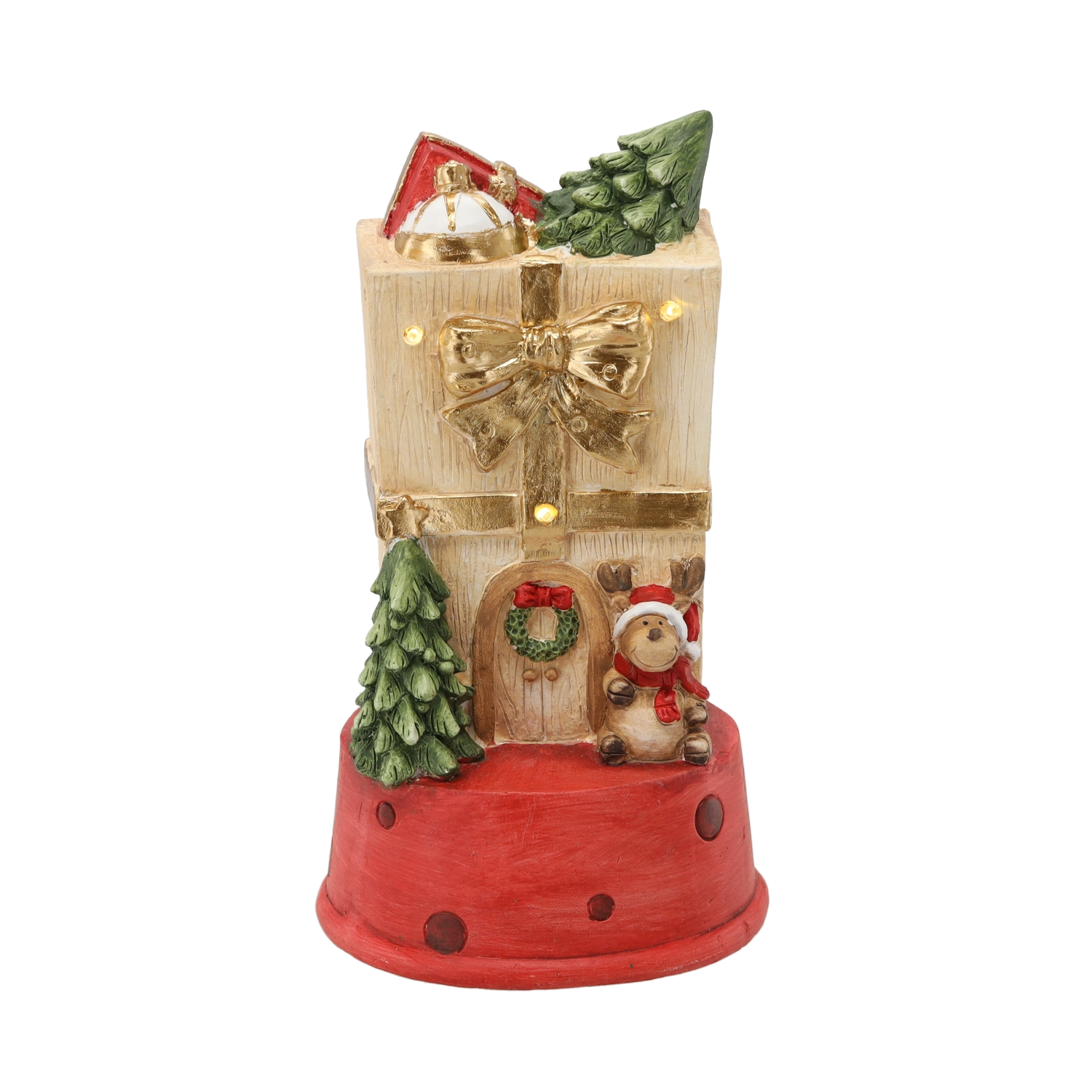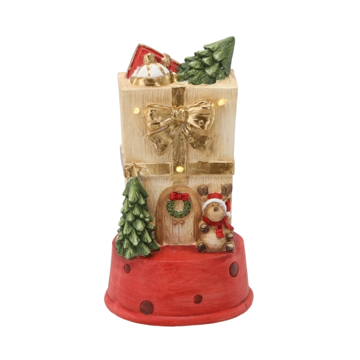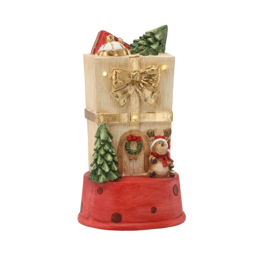Denne detaljerede juledekoration i form af et gavehus med en hjort bringer varme og hygge ind i hjemmet. Integrerede LED-lys giver en blid glød, som smukt understreger den festlige udsmykning uden at blænde.
