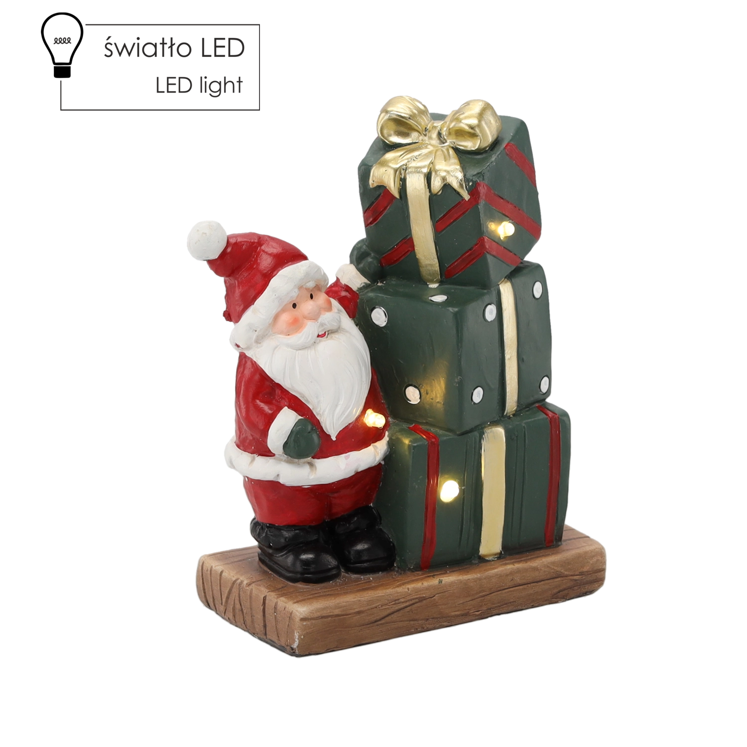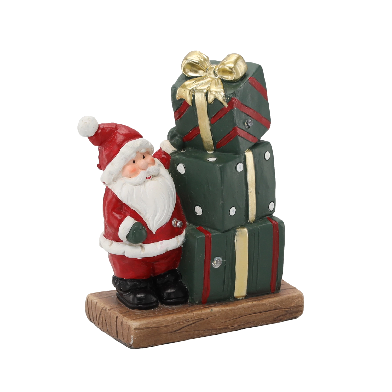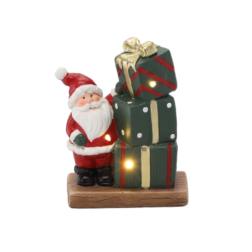 Giv dit hjem en hyggelig julestemning med denne dekorative JULEMAND-figur med gaver og integreret LED-belysning. Den stilfulde dekoration i holdbar polyresin byder på varmt LED-lys, detaljeret udførelse og stabil base til sikker placering på bord, hylde eller vindueskarm. Batterier medfølger, så du kan tænde dekorationen med det samme.