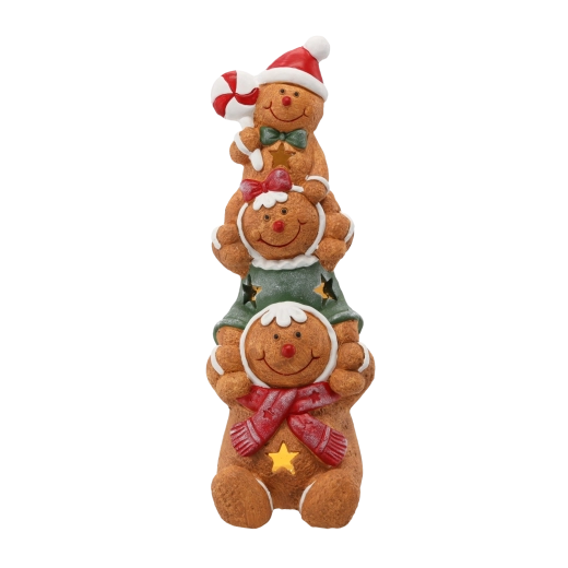 Skab en magisk julescene derhjemme med en figur af tre honningkagemænd, blidt oplyst af integreret LED-belysning. Dekorationen udmærker sig ved solidt håndværk i holdbar magnesiablanding og alsidige mål på 16 × 16 × 43 cm, som passer til de fleste hylder, kaminhylder og entréer.