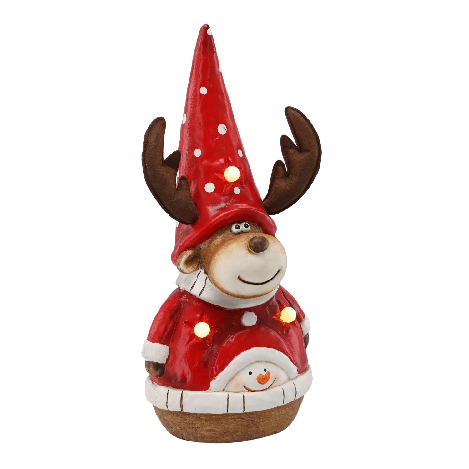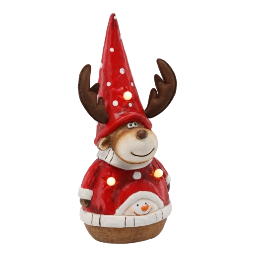 En sød juledekoration i form af et rensdyr med hue, der oplyser dit hjem takket være integreret LED-belysning. Stabil udførelse i holdbar magnesiakeramik, praktisk strømforsyning med 3× AAA-batterier og alsidige mål 26 × 16,5 × 48 cm gør den til et ideelt tilbehør til kommoden, under træet eller i entréen.