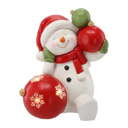 En charmerende juledekoration i form af en snemand med kugler, der oplyser dit hjem takket være integreret LED-belysning. Figuren af robust magnesiumkeramik placeres nemt på en hylde, kommode eller vindueskarm. Praktisk strømforsyning med 3× AAA-batterier (medfølger ikke) sikrer sikker og fleksibel drift uden kabler.