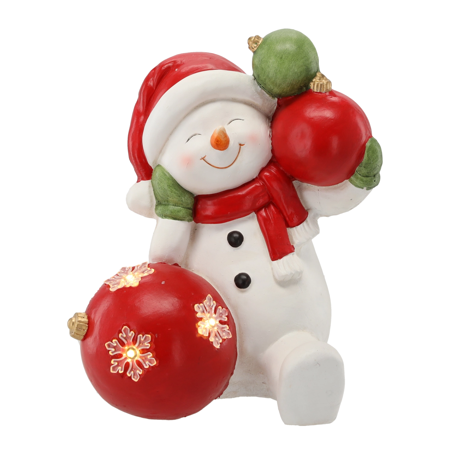 Denne detaljerede julefigur af en snemand med kugler bringer en varm, festlig stemning ind i rummet. Det blide LED-lys fremhæver dekorationen og skaber behagelige lysaccenter i de lange vinteraftener. Takket være det robuste materiale af magnesia er dekorationen stabil og holdbar.