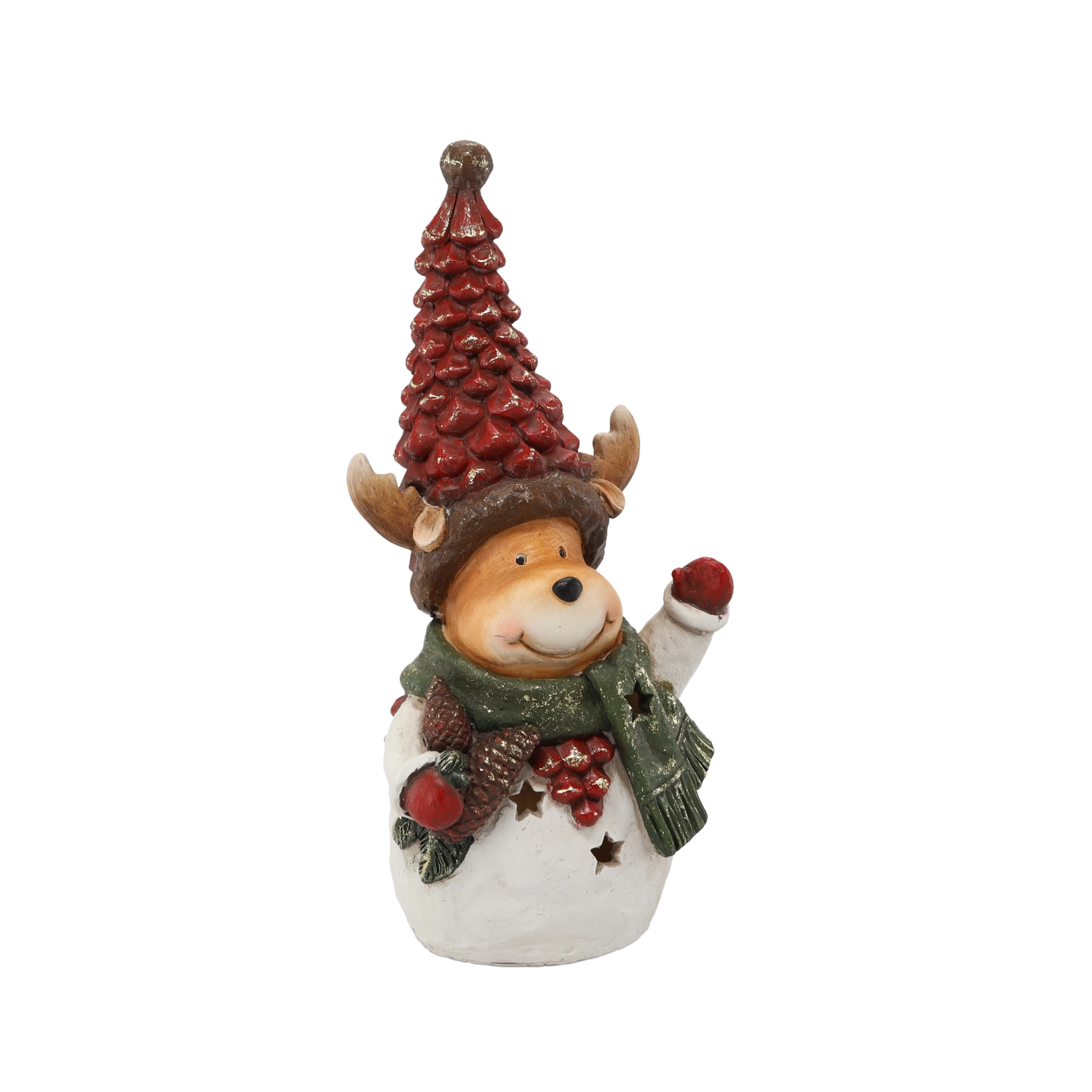 Elegant juledekoration i holdbar polyresin, som bringer varme og festlig stemning ind i hjemmet. Figuren af bjørn eller ren med strikket hue og halstørklæde er detaljerigt bemalet, og det LED-lys får stjerneudskæringerne på kroppen til at gløde blidt.